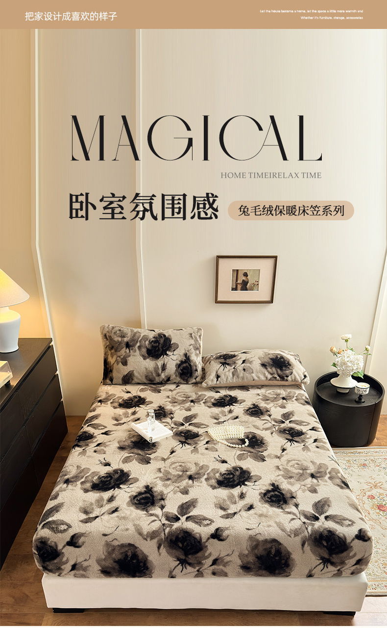 娜娜 2025新款兔毛绒保暖床笠 黑牡丹