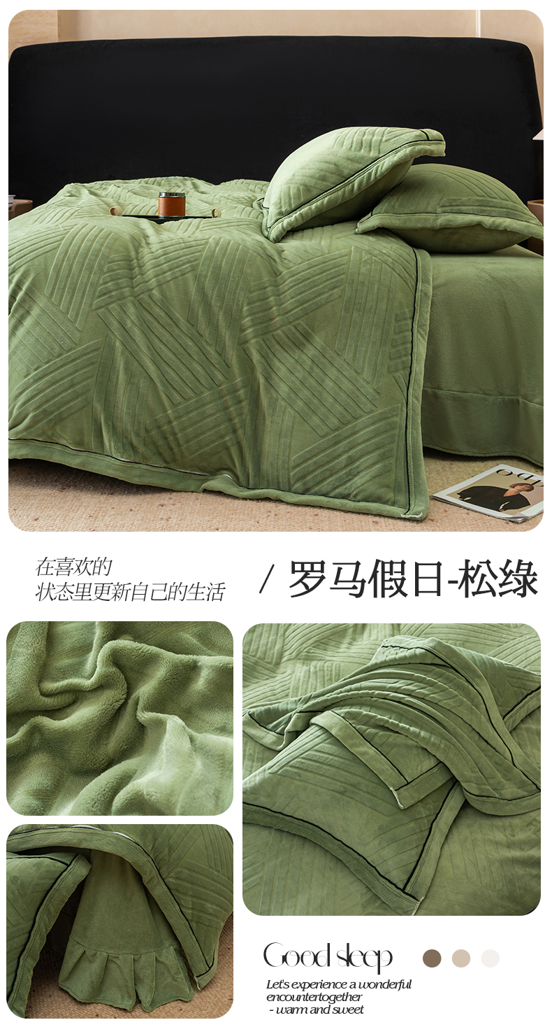 商品名称:满座家居 2025新款高克重牛奶绒雕花四件套-罗马假日 罗马假日-松绿