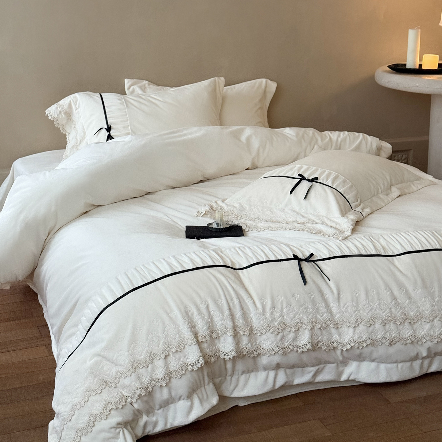 (总)佳汐蓝 2025春夏新品双层皱皱纱刺绣+织带+荷叶边四件套--白茶花,奶白,曲奇