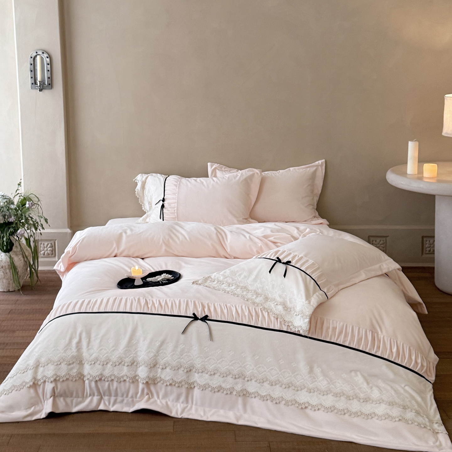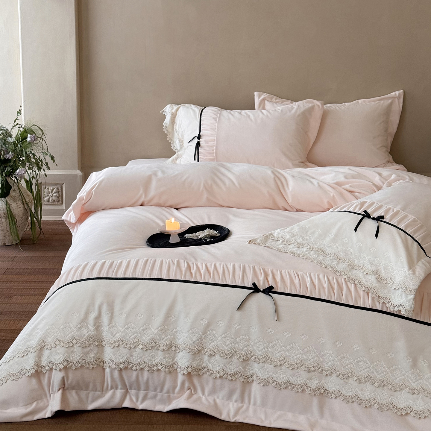 商品名称:佳汐蓝家纺 2025新款230g婴肤绒立体刺绣双层花边四件套-邂逅(控价:卷后不低于338元) 邂逅-粉色