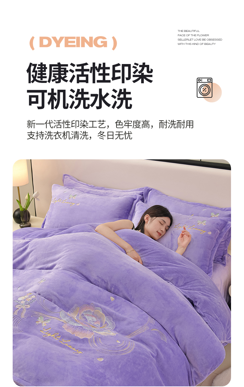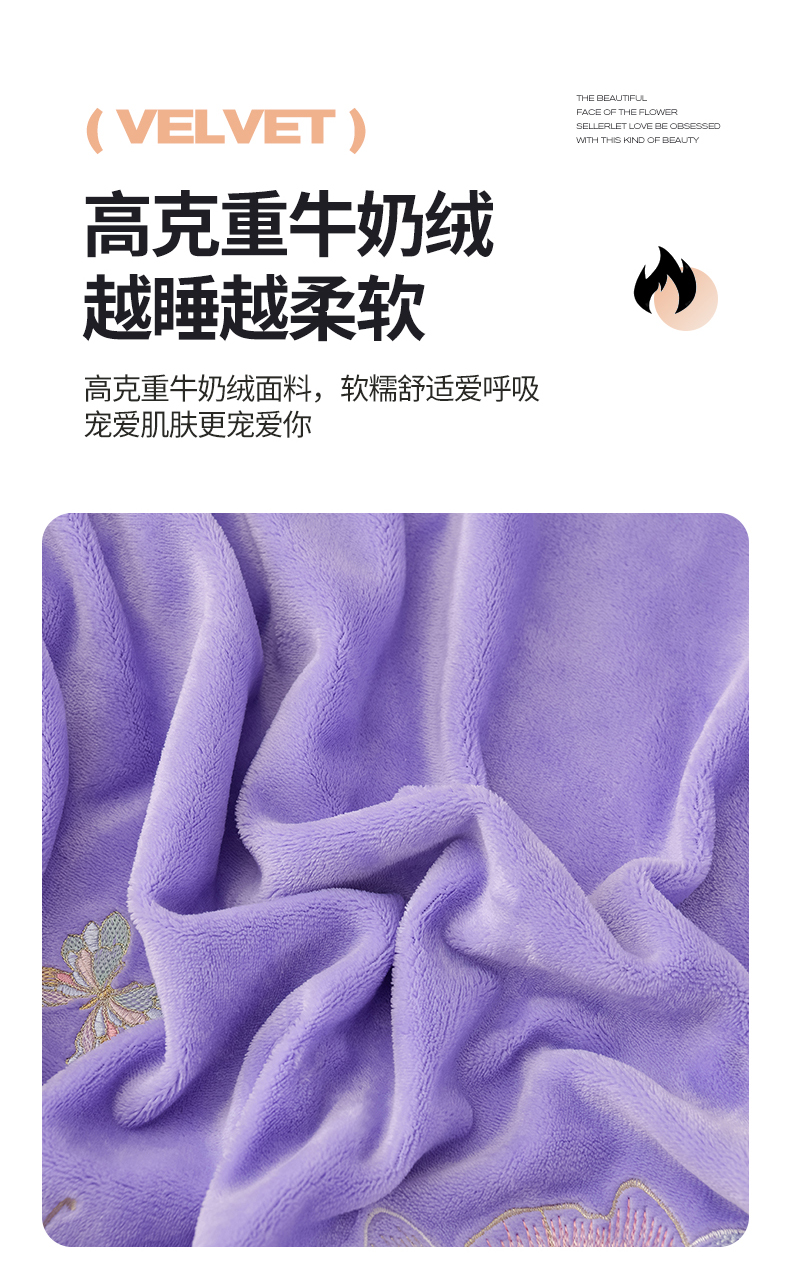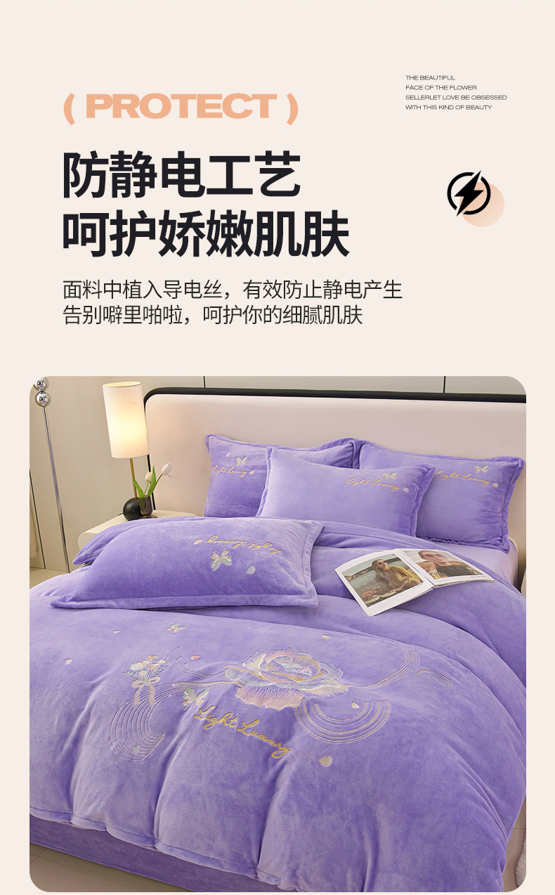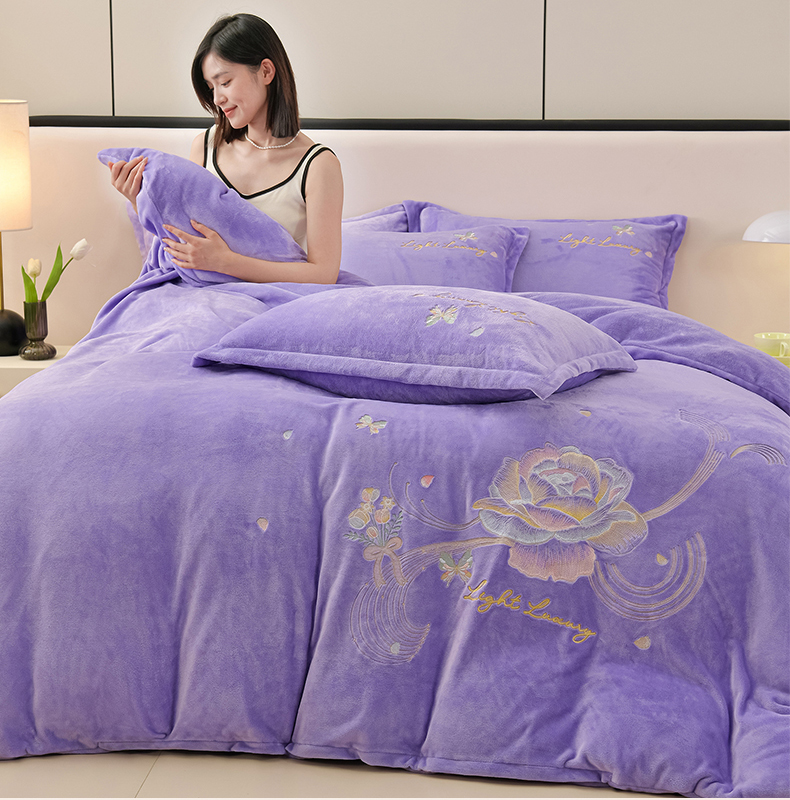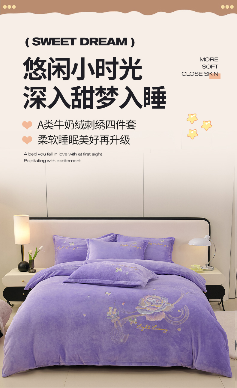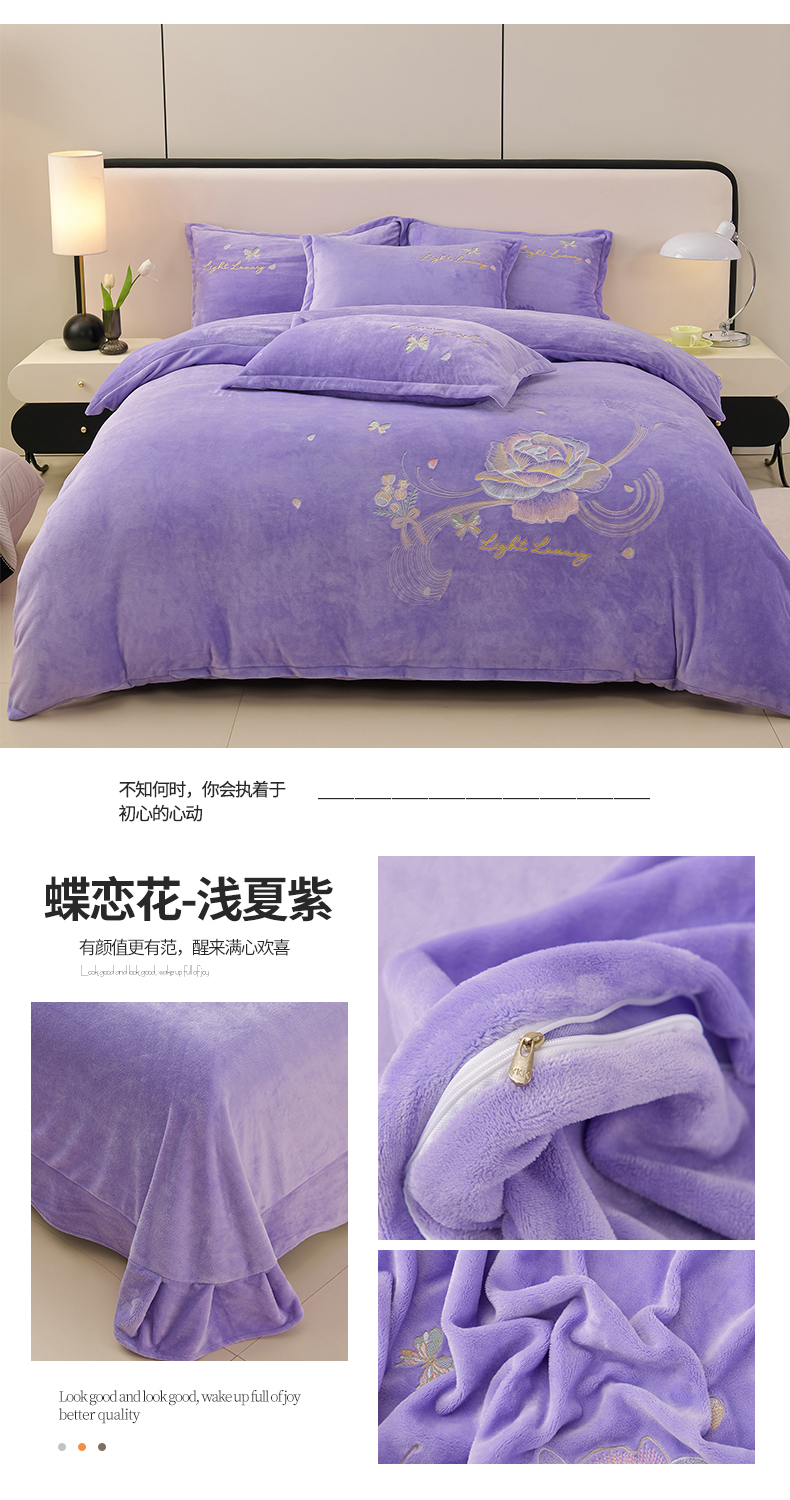 商品名称:绒小宣 2025新款A类牛奶绒刺绣四件套-蝶恋花 浅夏紫