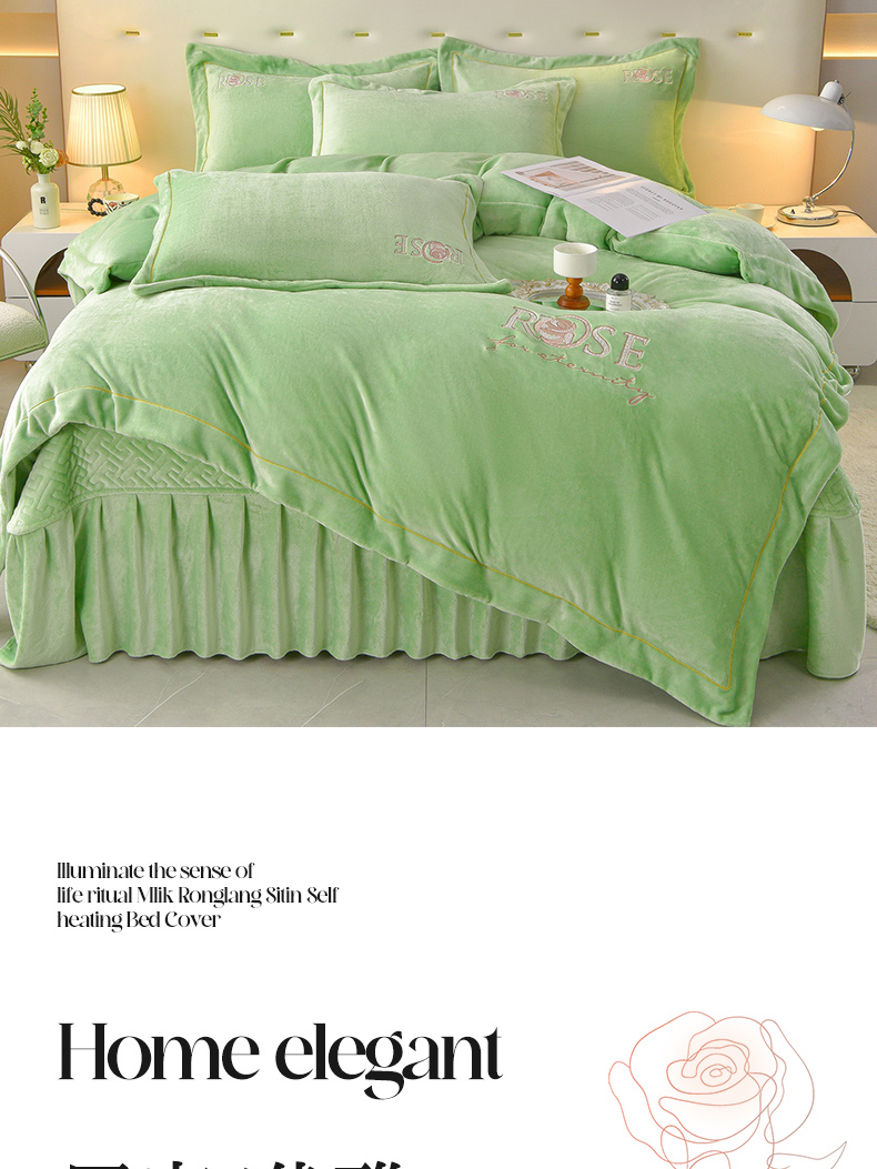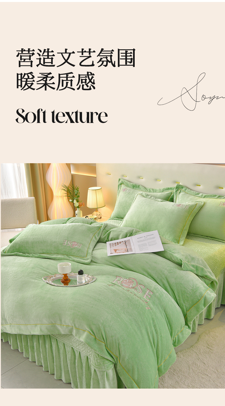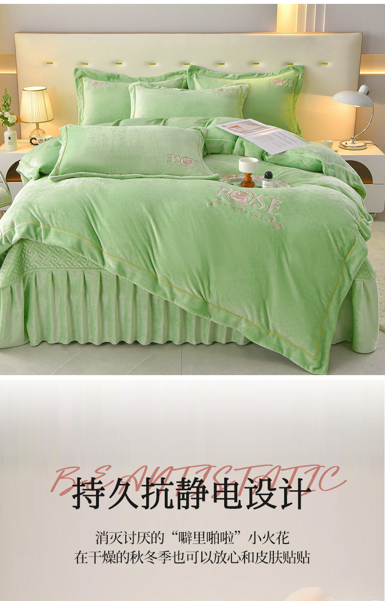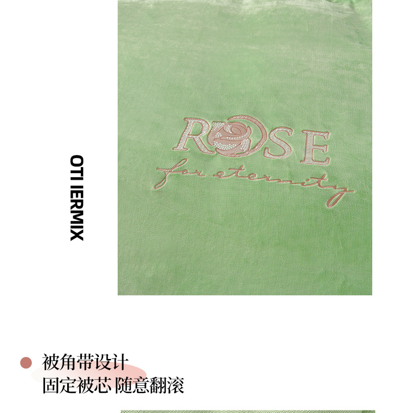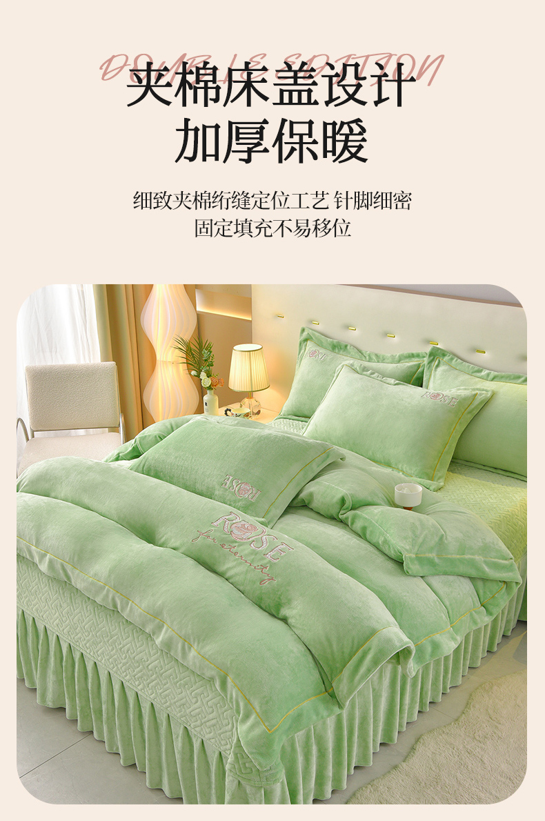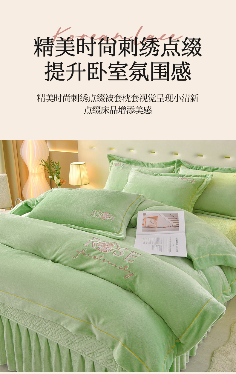 商品名称:绒小宣 2025新款加厚牛奶绒四件套宽边一字绣牛奶绒刺绣花夹棉床盖款四件套-玫瑰花语 玫瑰花语-绿色