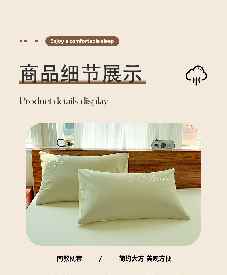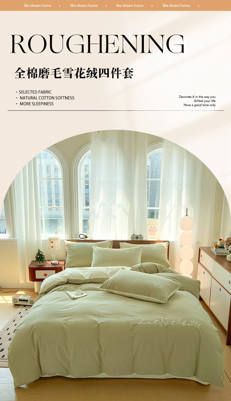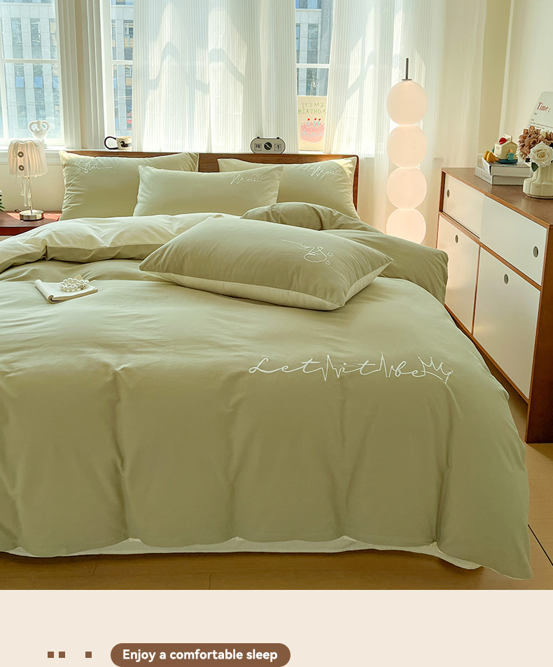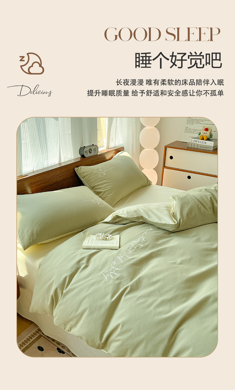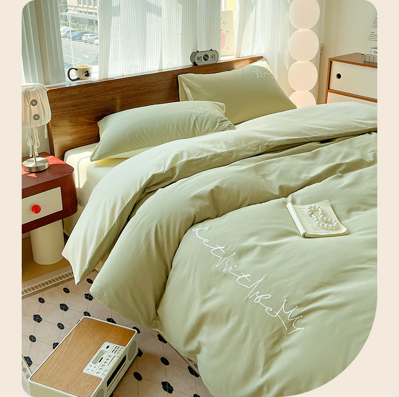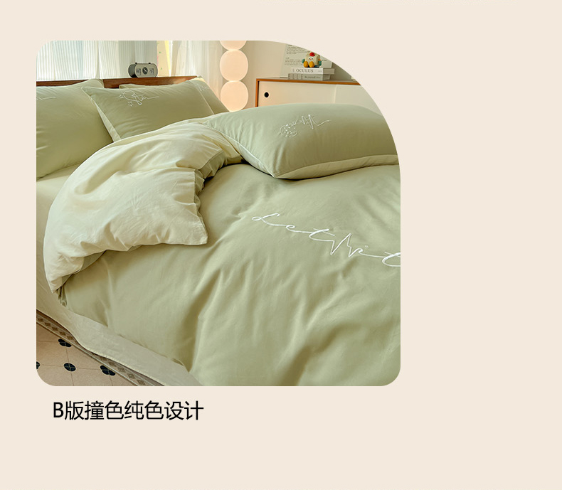 商品名称:有点武功 2025冬季新款百分百全棉磨毛纯色双拼刺绣四件套小清新风 果绿黄