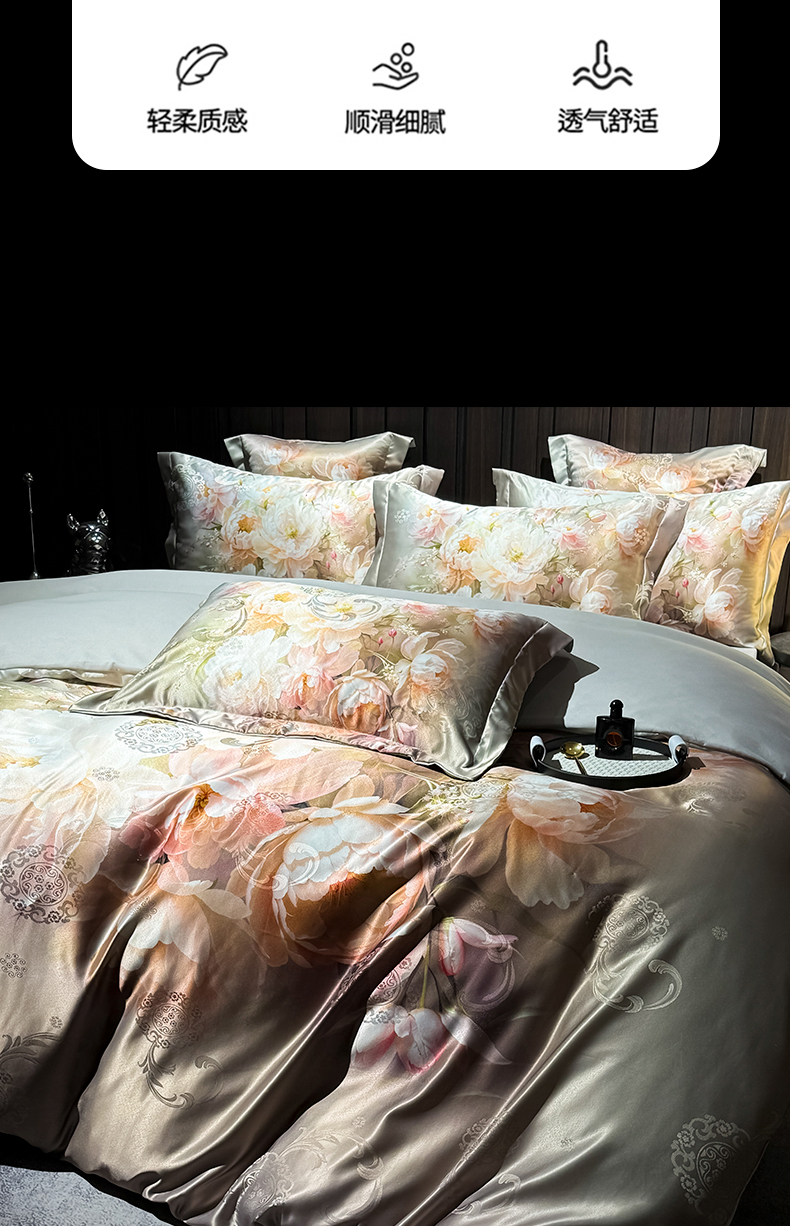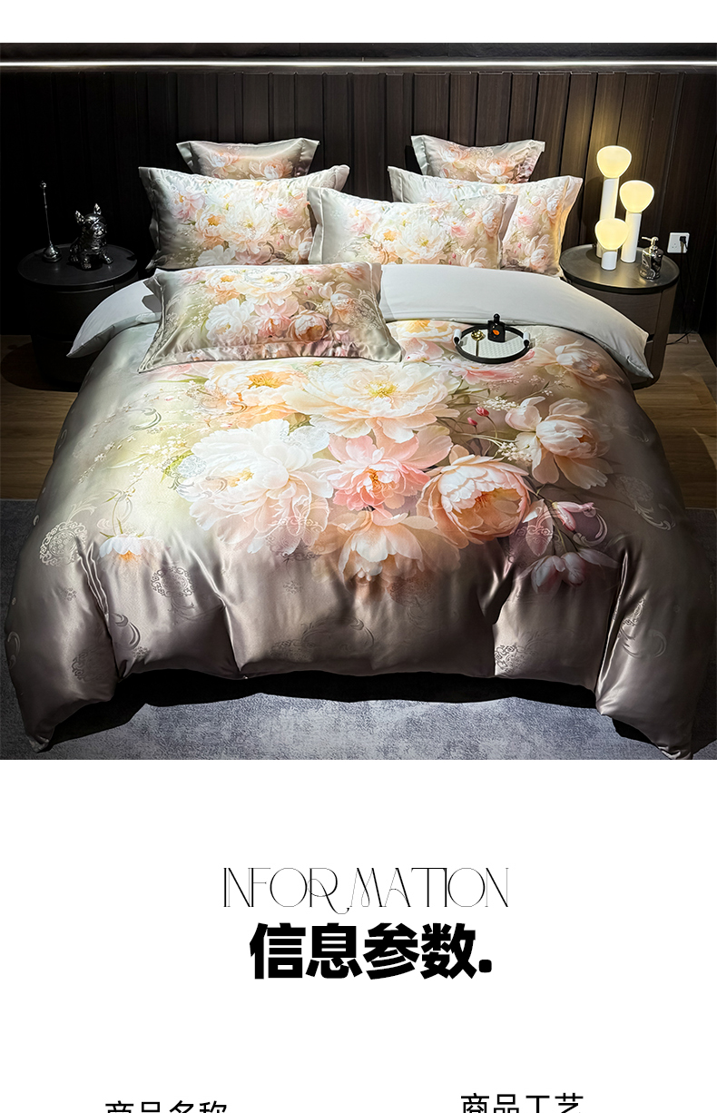 商品名称:七夜居 2025新款直播爆款欧式大阪轻奢贡缎提花加数码印花磨毛四件套 国色天香