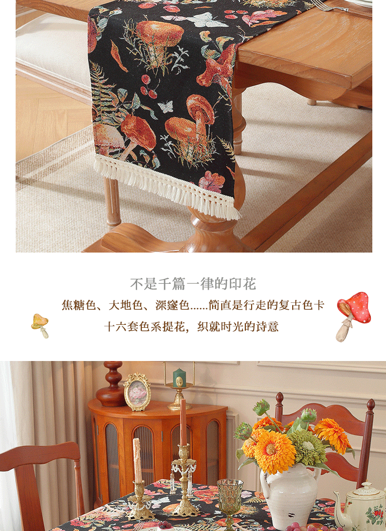 (总)南通大梧纺织 2025新款复古森林秘境黑蘑菇园桌旗,黑蘑菇园 35*120cm(含吊穗),黑蘑菇园 35*160cm(含吊穗),黑蘑菇园 35*180cm(含吊穗),黑蘑菇园 35*210cm(含吊穗),黑蘑菇园 35*240cm(含吊穗),黑蘑菇园 35*270cm(含吊穗),黑蘑菇园 35*300cm(含吊穗),黑蘑菇园 35*350cm(含吊穗)