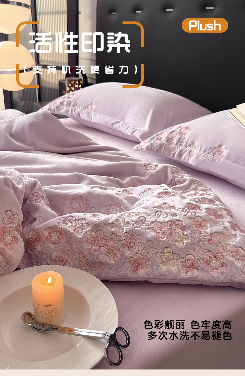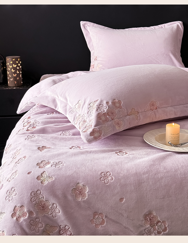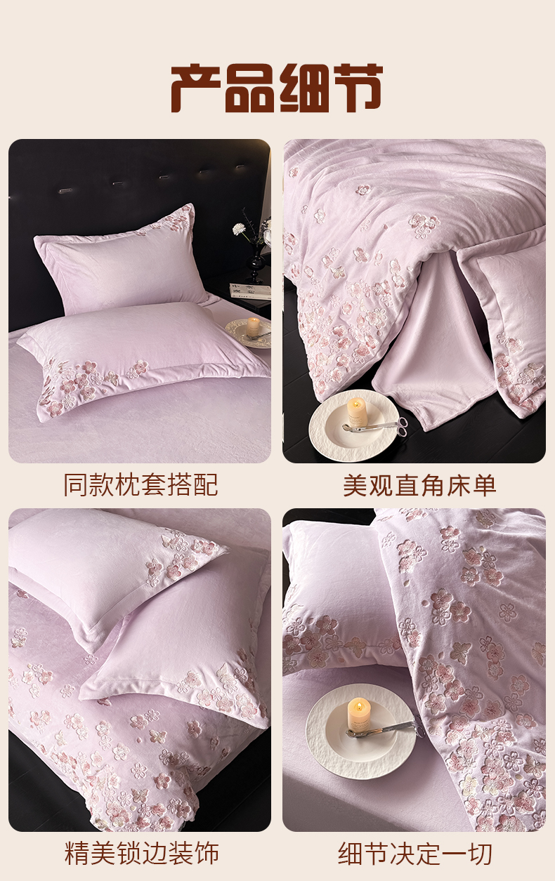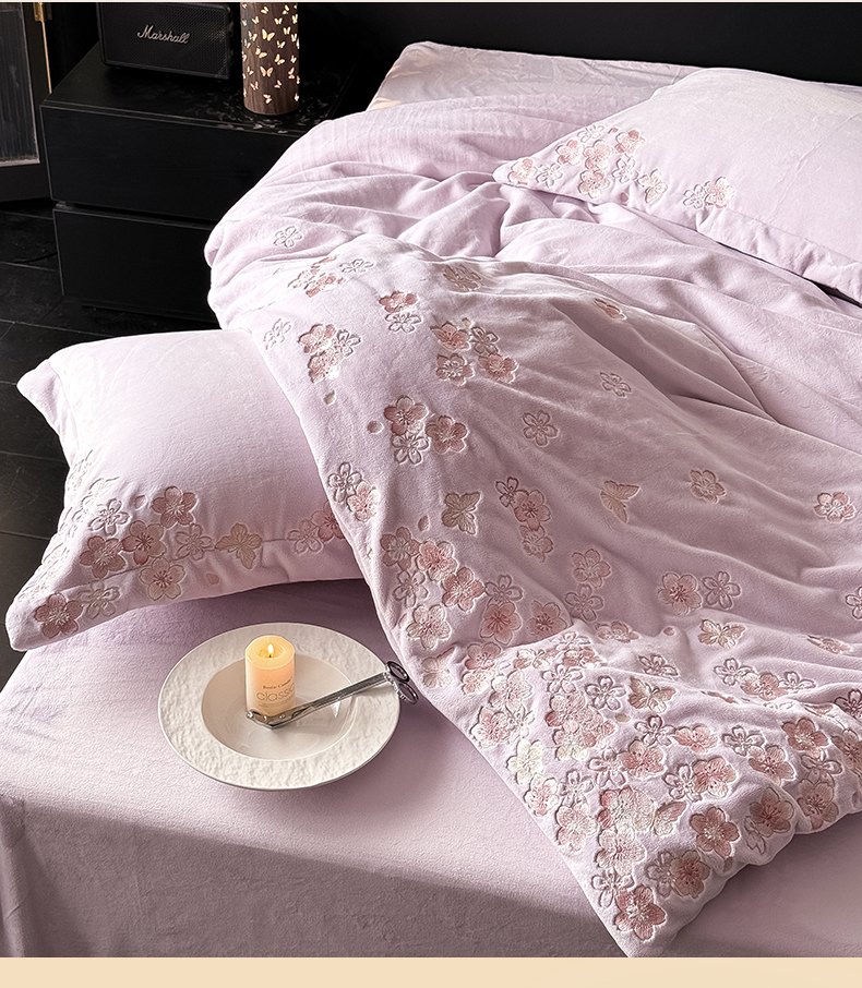 商品名称:水云缦 2025新款230克全消光牛奶绒绣花四件套-樱花系列 樱花-浅紫