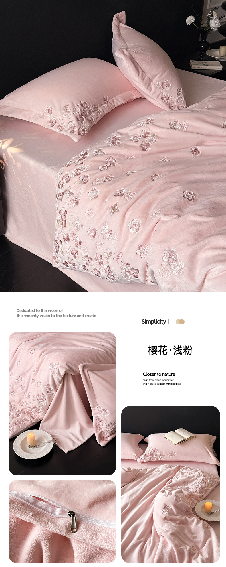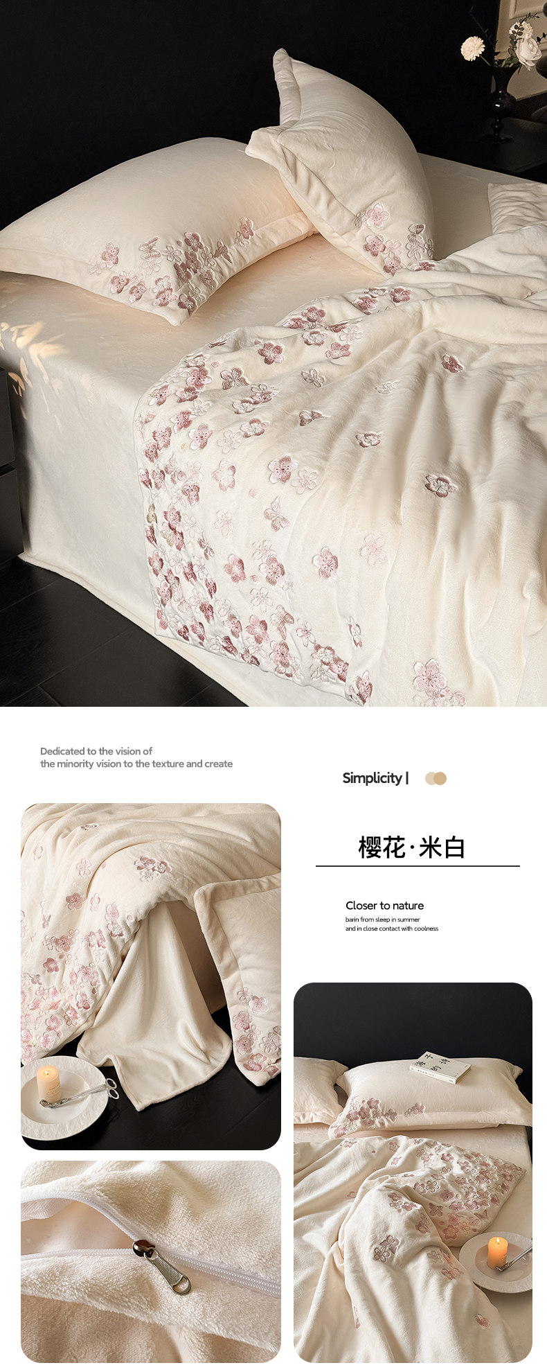 (总)水云缦 2025新款230克全消光牛奶绒绣花四件套-樱花系列,樱花-米白,樱花-高级灰,樱花-浅紫,樱花-浅粉
