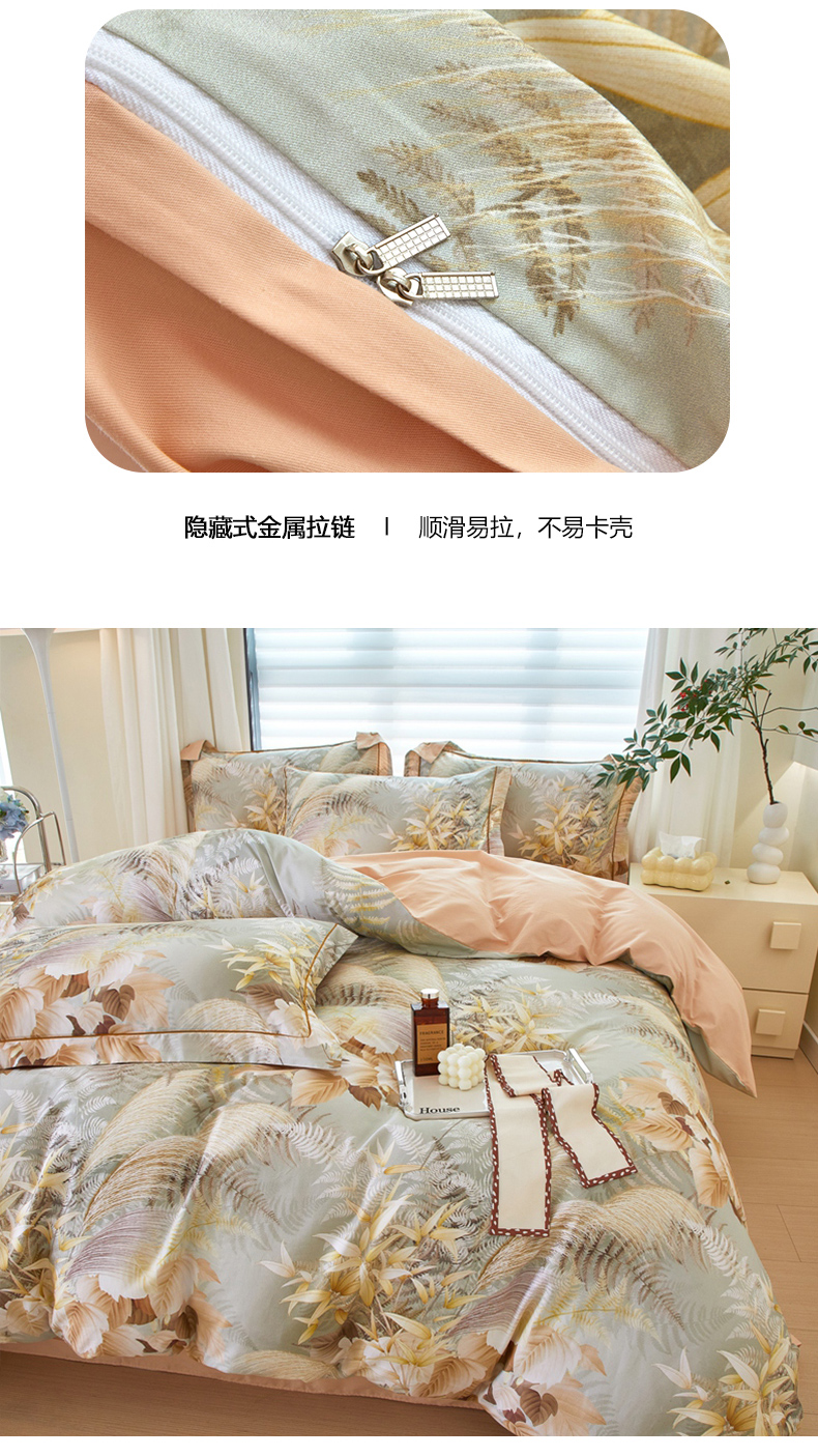 (总)优姿家纺 2026新款全棉40匹马棉数码印花四件套,淡墨香黄,淡墨香兰,花的旅途桔,暮云春树灰,清风梦叶粉,田园绿