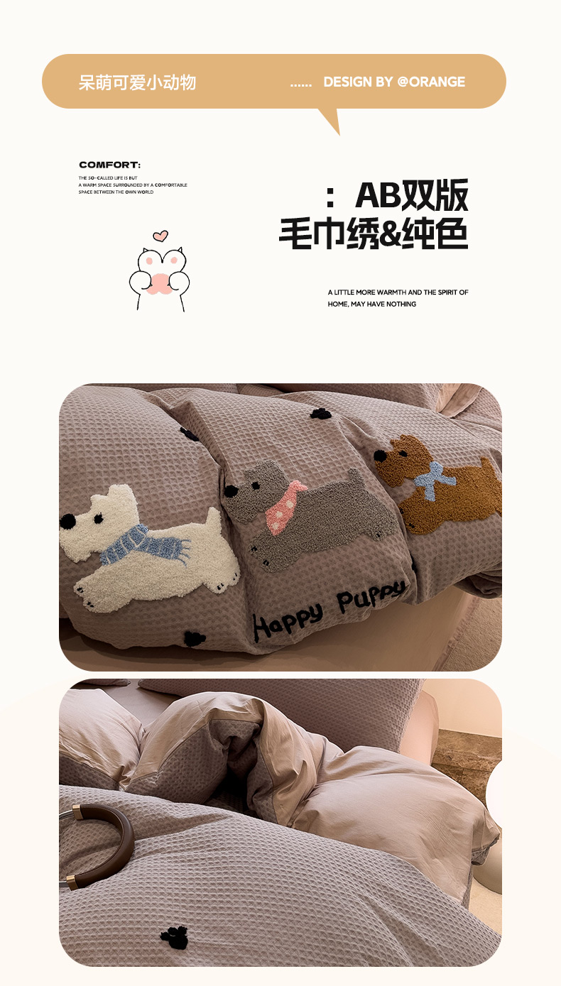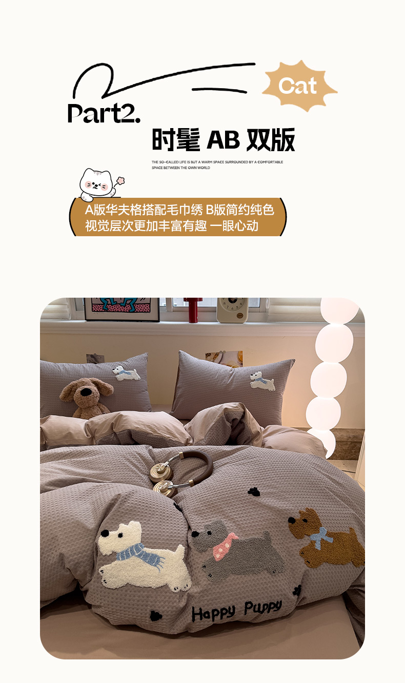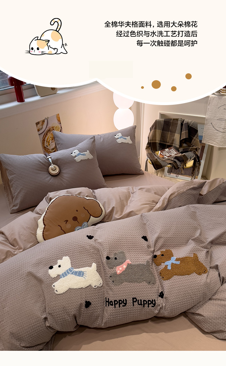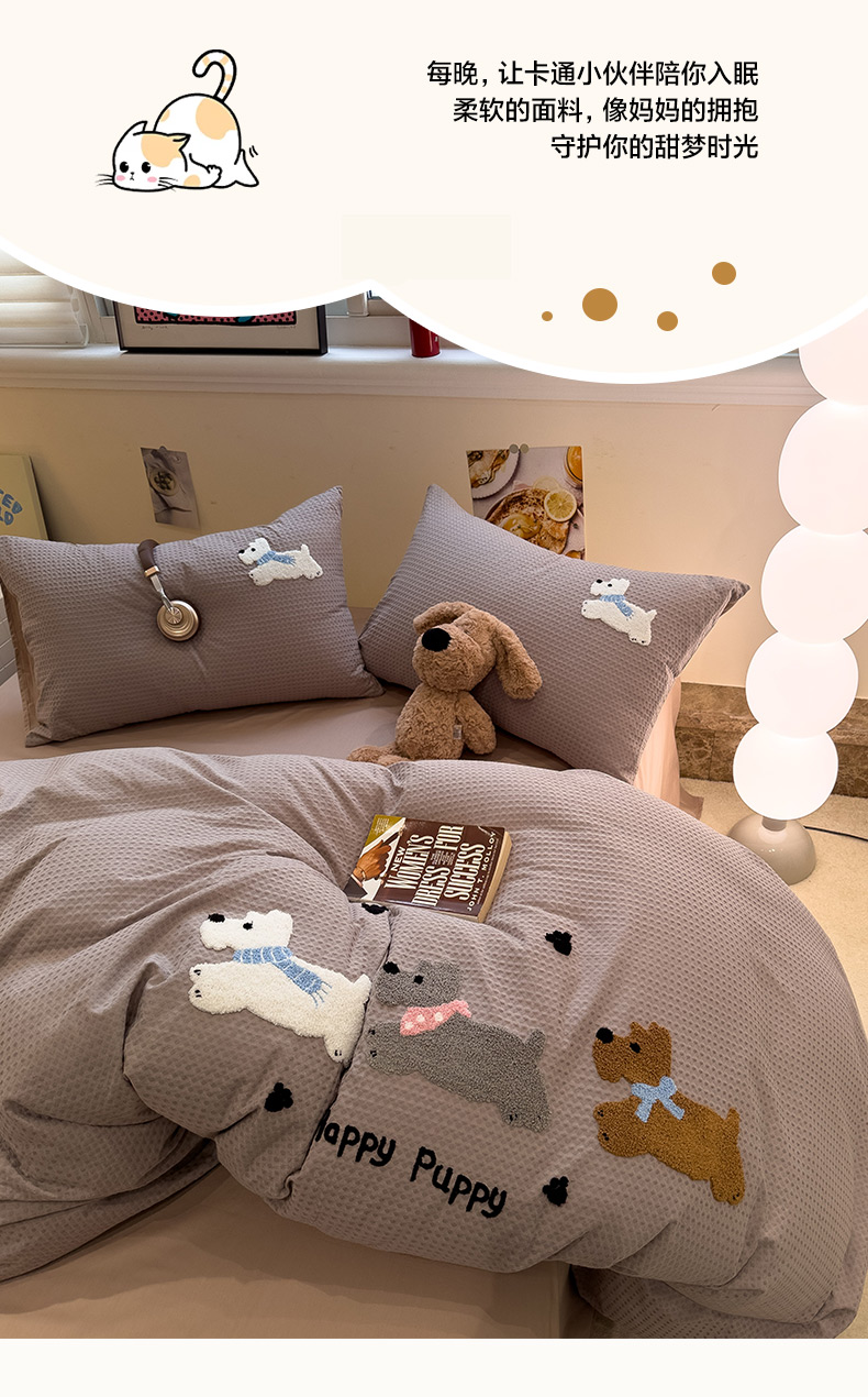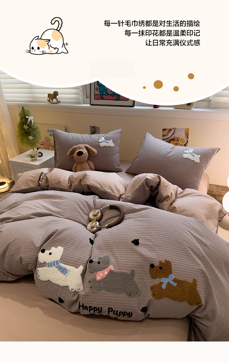 当前位置: 91家纺网 > 商品网购 > 床品套件 > 四件套 > 全棉普通四件套 > 雅居纺家纺 2026新款全棉华夫格毛巾绣四件套 浅灰围脖小狗