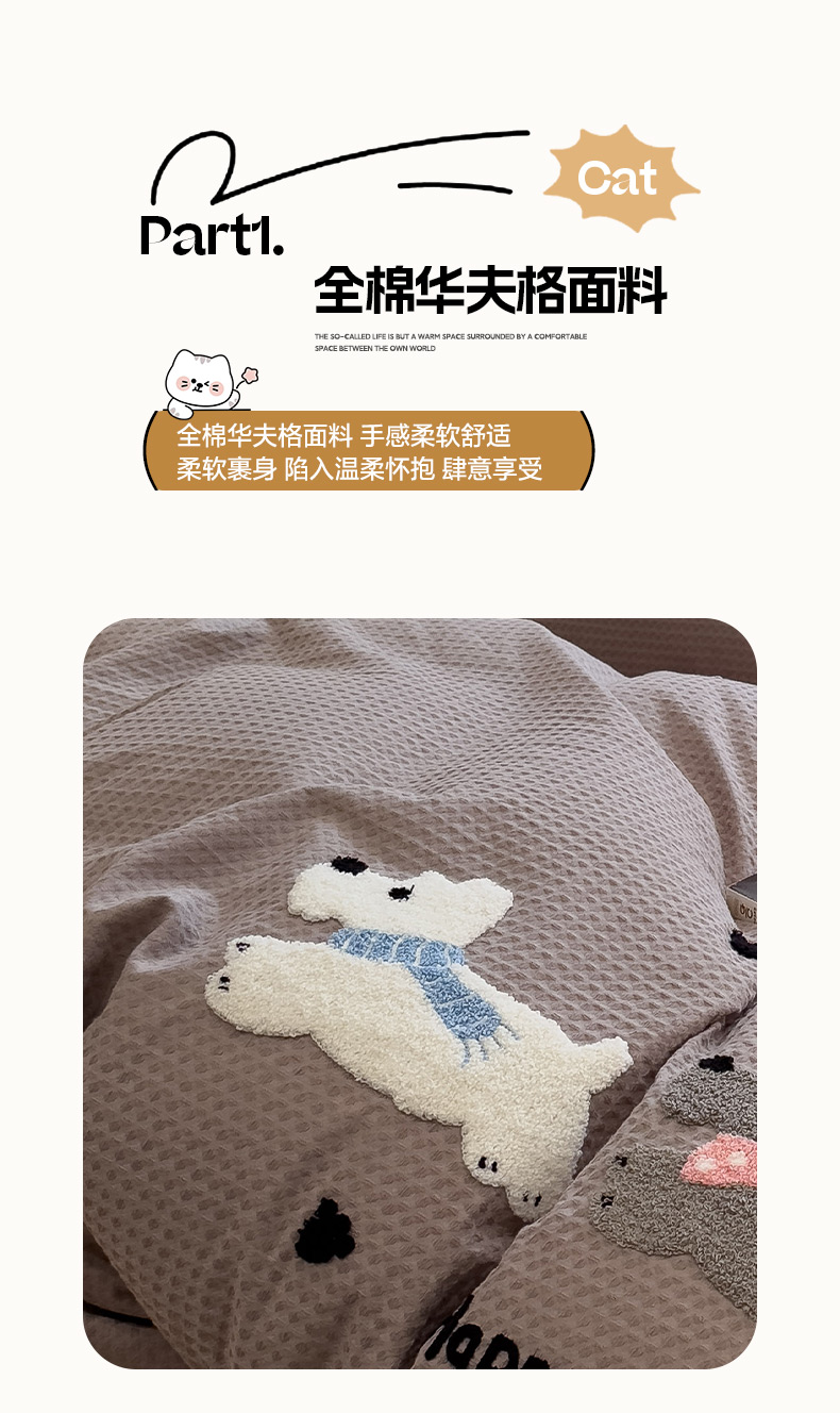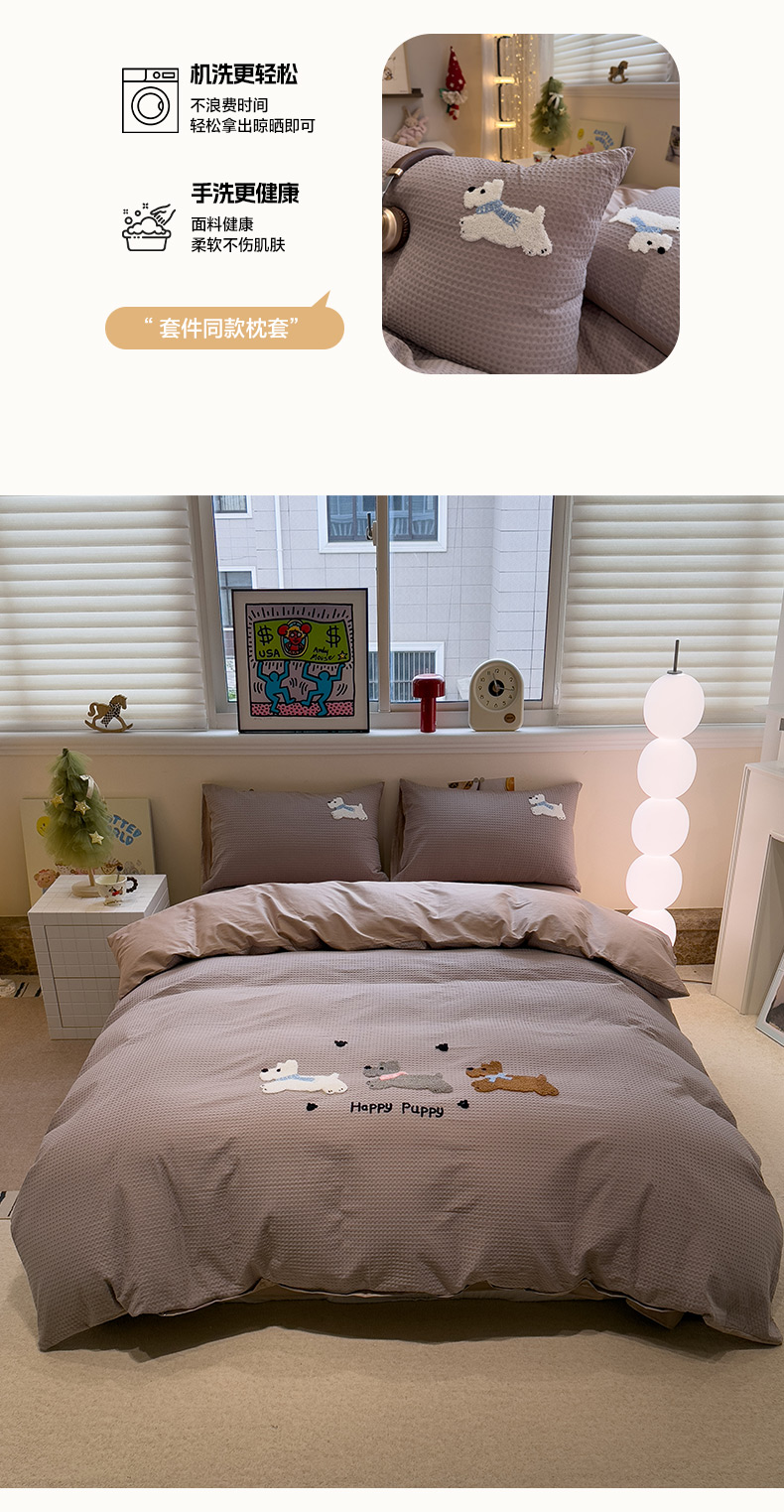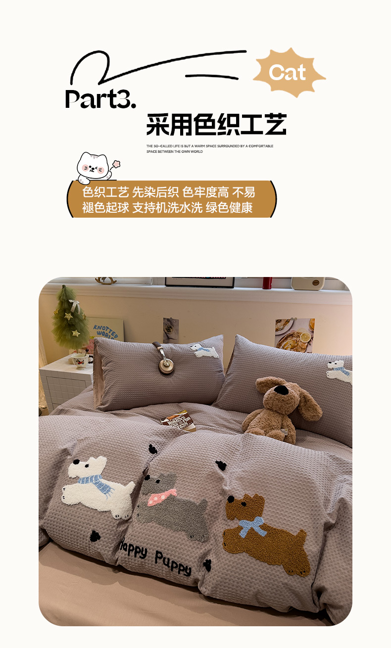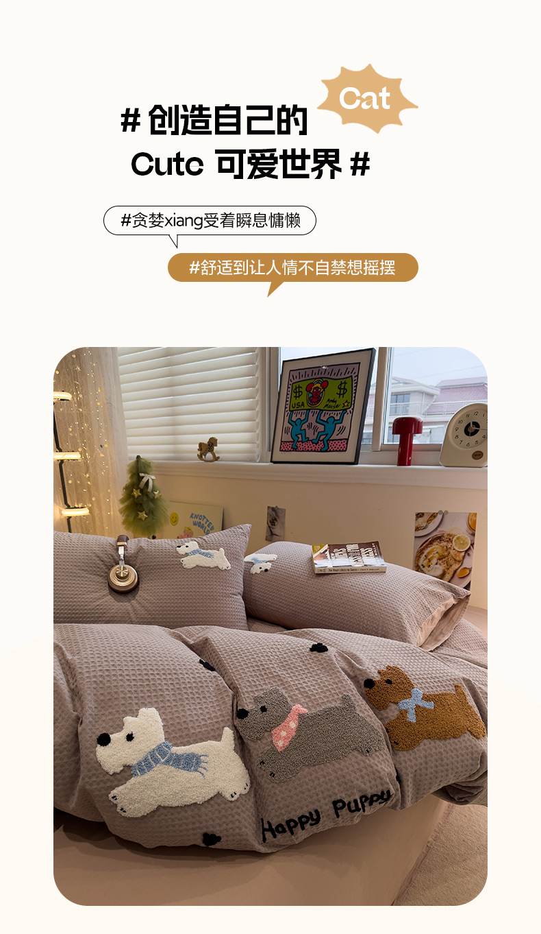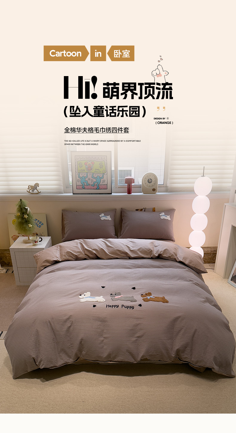 当前位置: 91家纺网 > 商品网购 > 床品套件 > 四件套 > 全棉普通四件套 > 雅居纺家纺 2026新款全棉华夫格毛巾绣四件套 浅灰围脖小狗