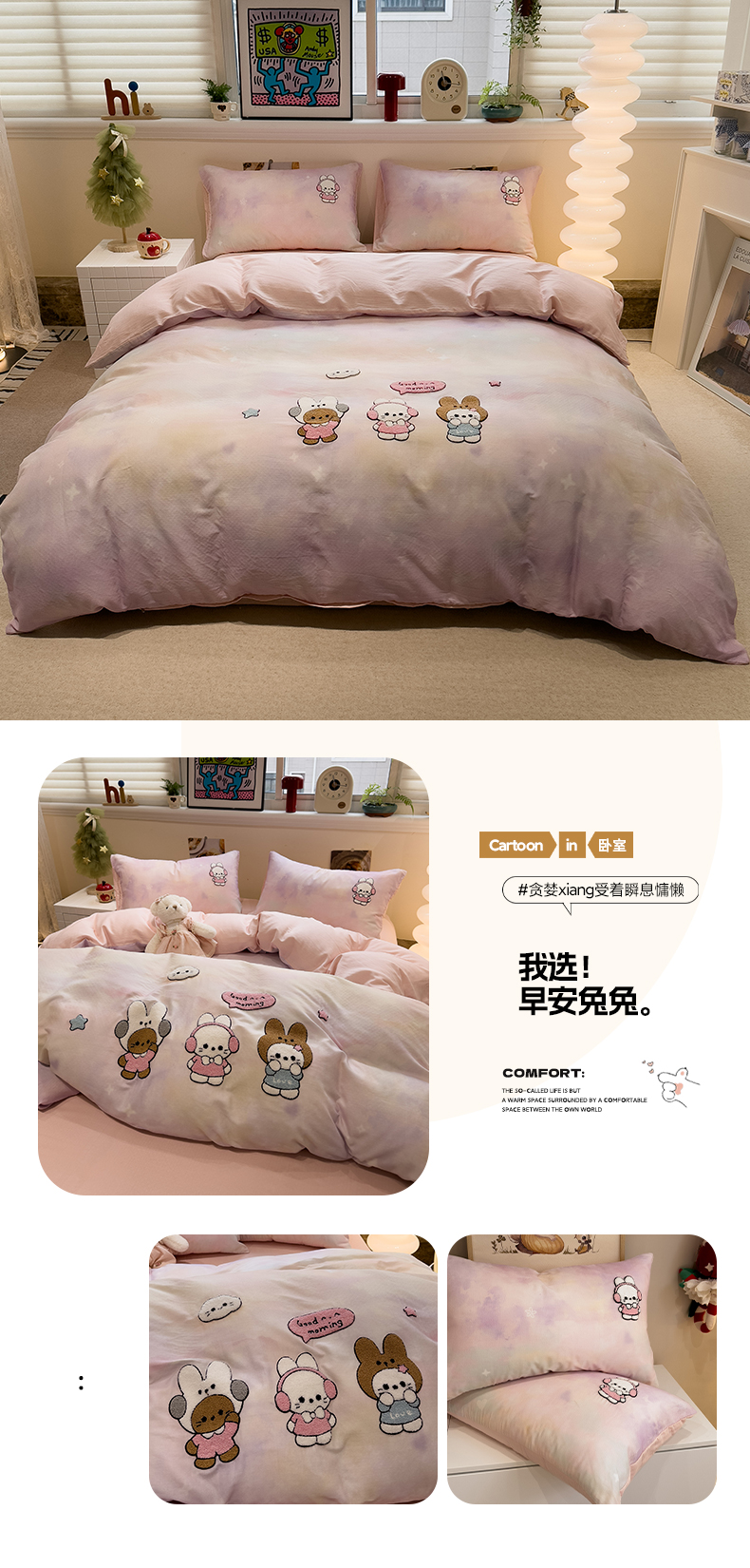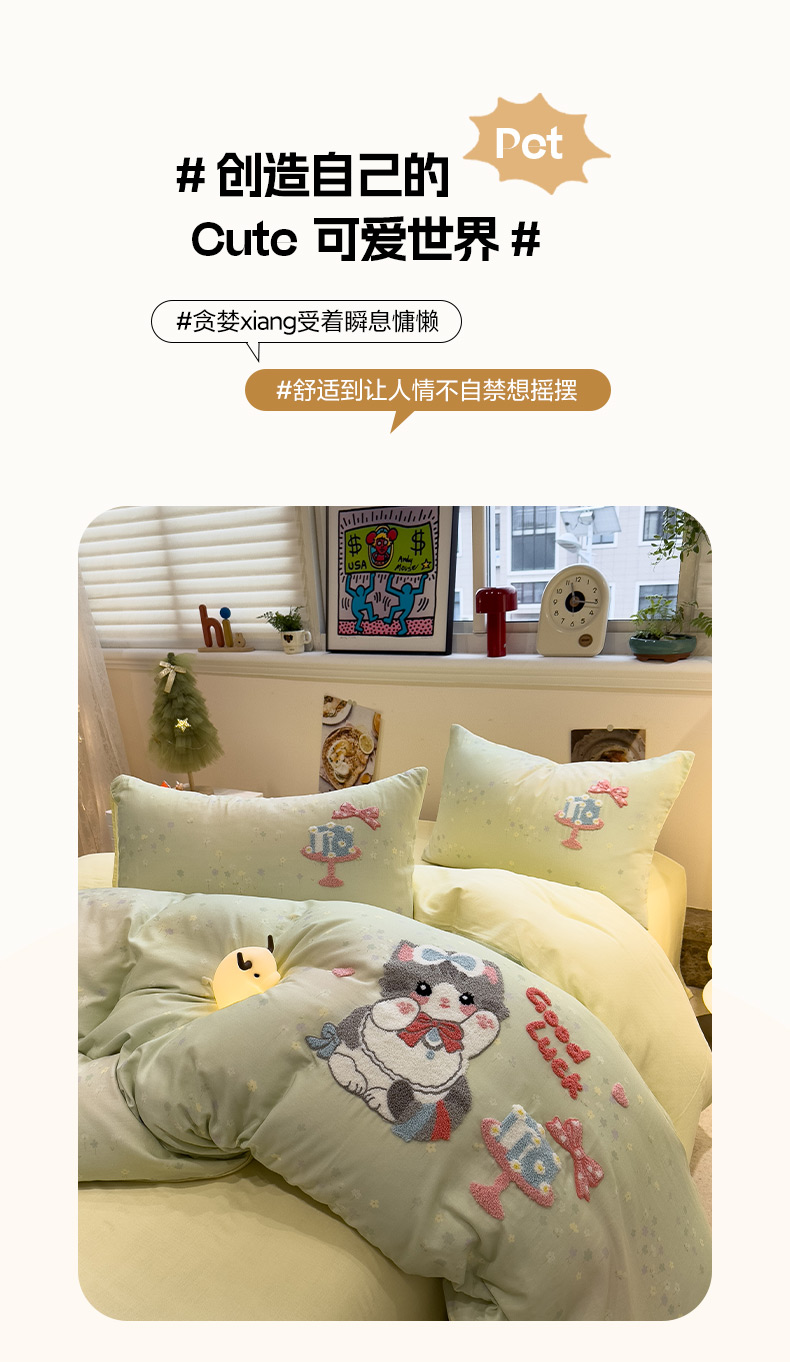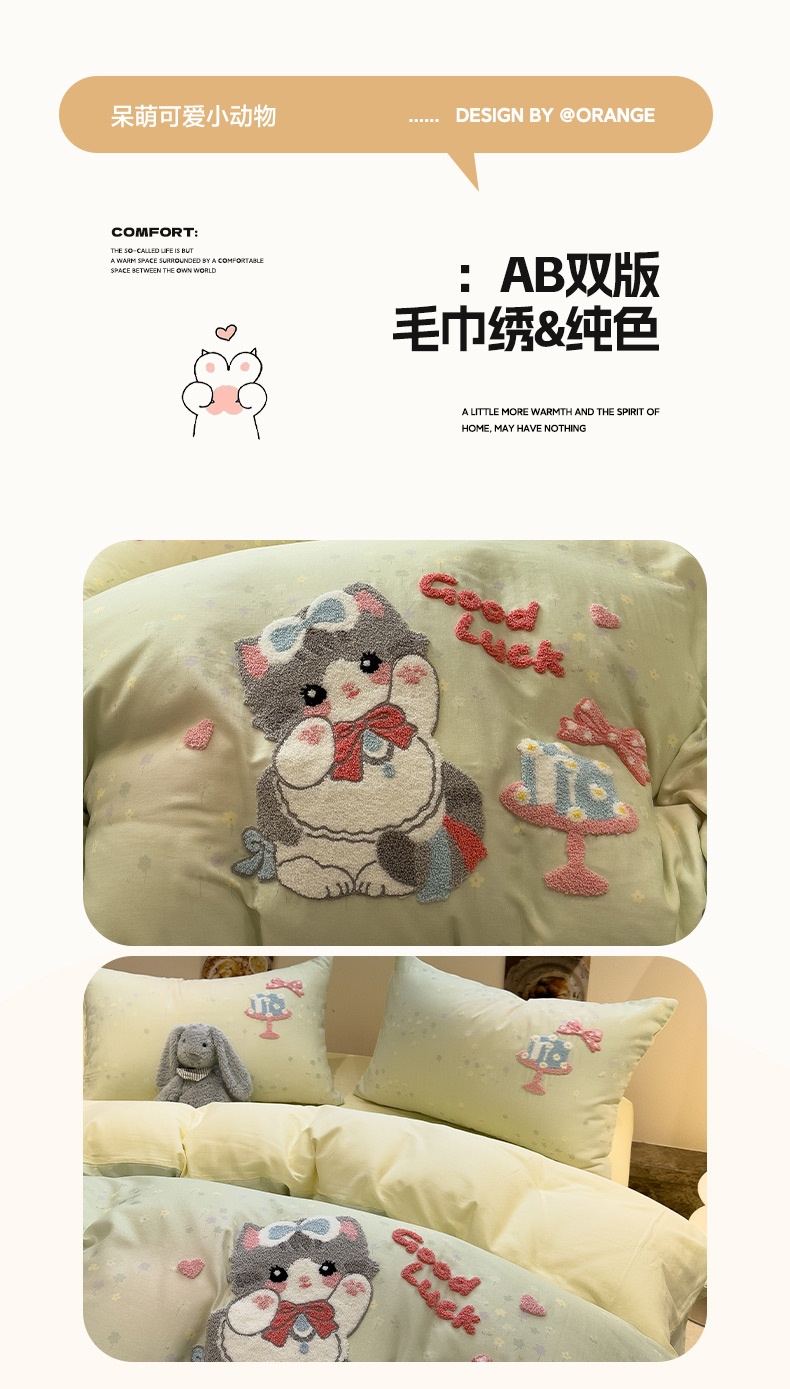 (总)雅居纺家纺 2026新款全棉双层纱毛巾绣四件套,蛋糕猫咪,红苹果小狗,萌宠甜品,早安兔兔