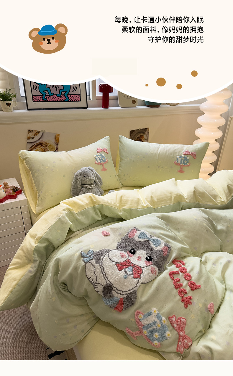 雅居纺家纺 2026新款全棉双层纱毛巾绣四件套 蛋糕猫咪