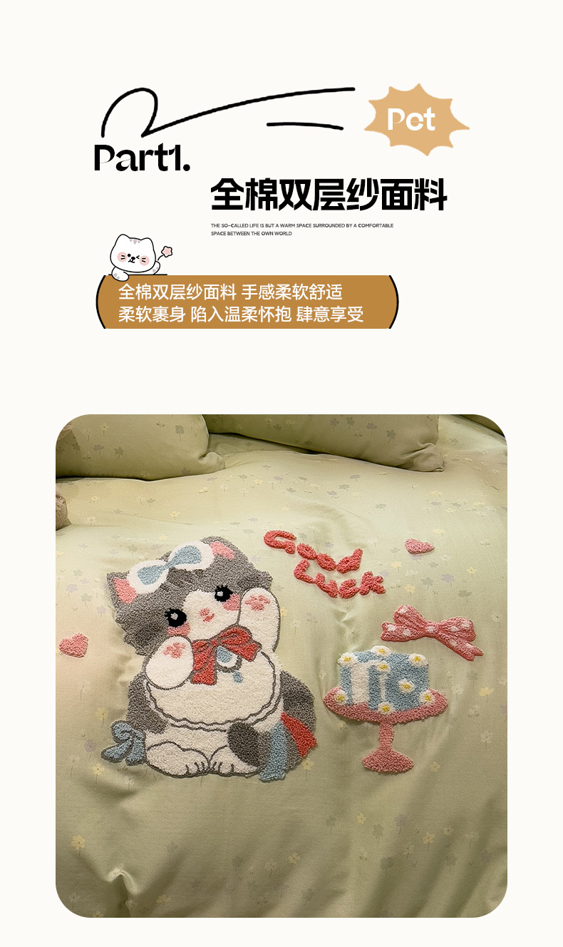 商品名称:雅居纺家纺 2026新款全棉双层纱毛巾绣四件套 蛋糕猫咪