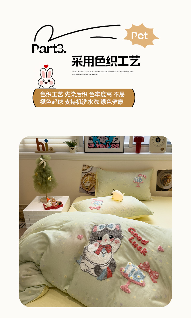 (总)雅居纺家纺 2026新款全棉色织水洗棉毛巾绣猫咪四件套,绿格猫咪,木马猫咪,派对小猫,气球猫咪,星星猫咪,幸福猫咪