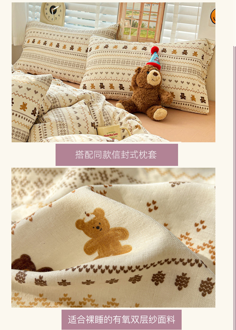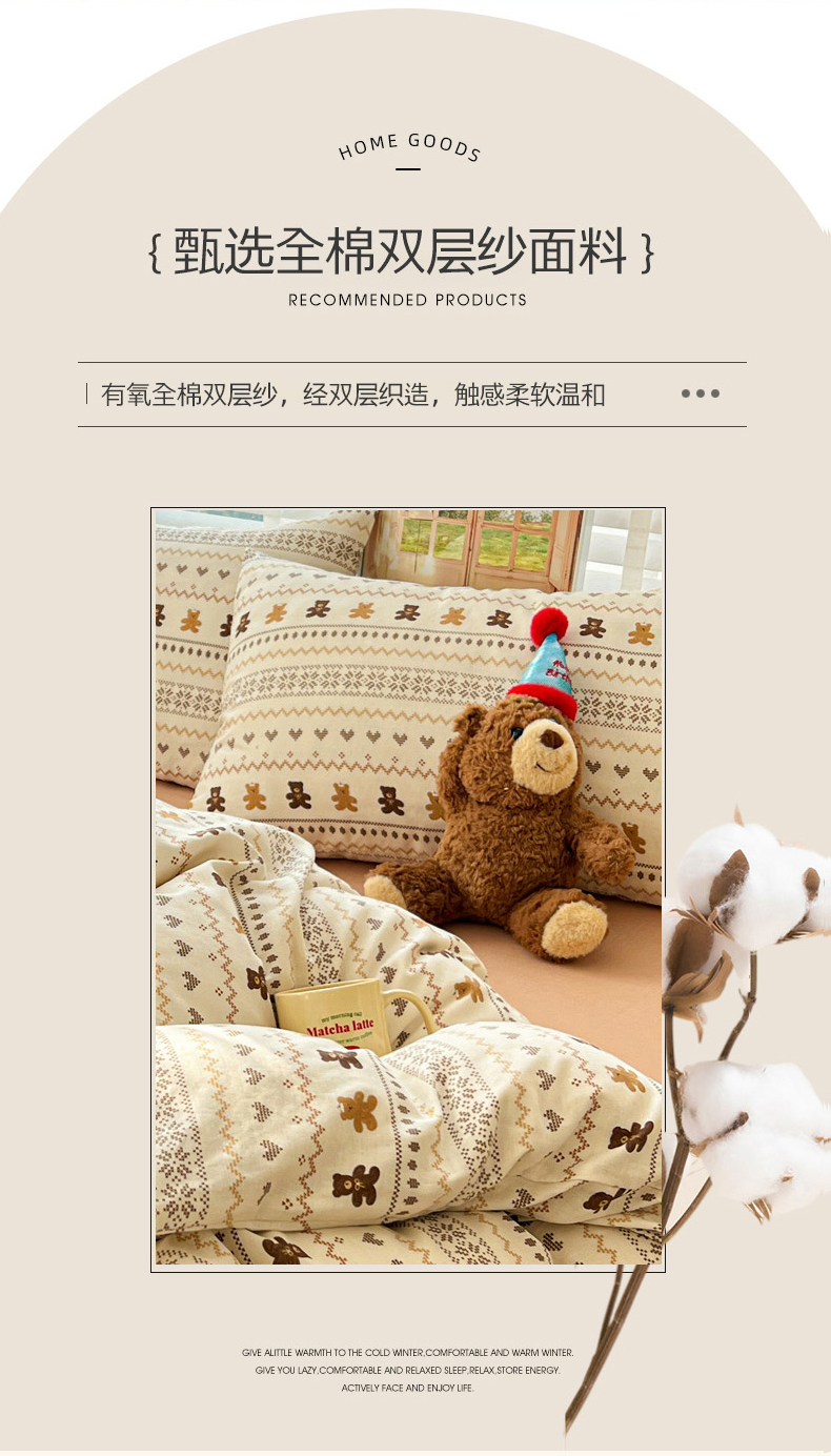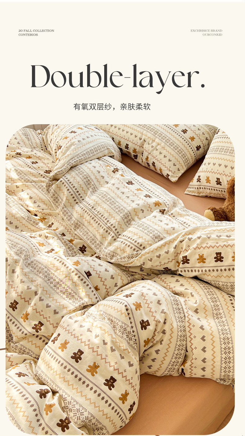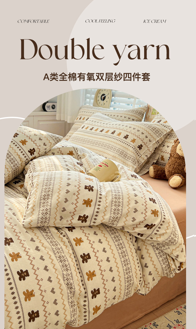当前位置: 91家纺网 > 商品网购 > 床品套件 > 四件套 > 双层纱四件套 > 麦伦家居 2026春夏新品全棉有氧双层纱印花系列简约款四件套 费尔岛小熊