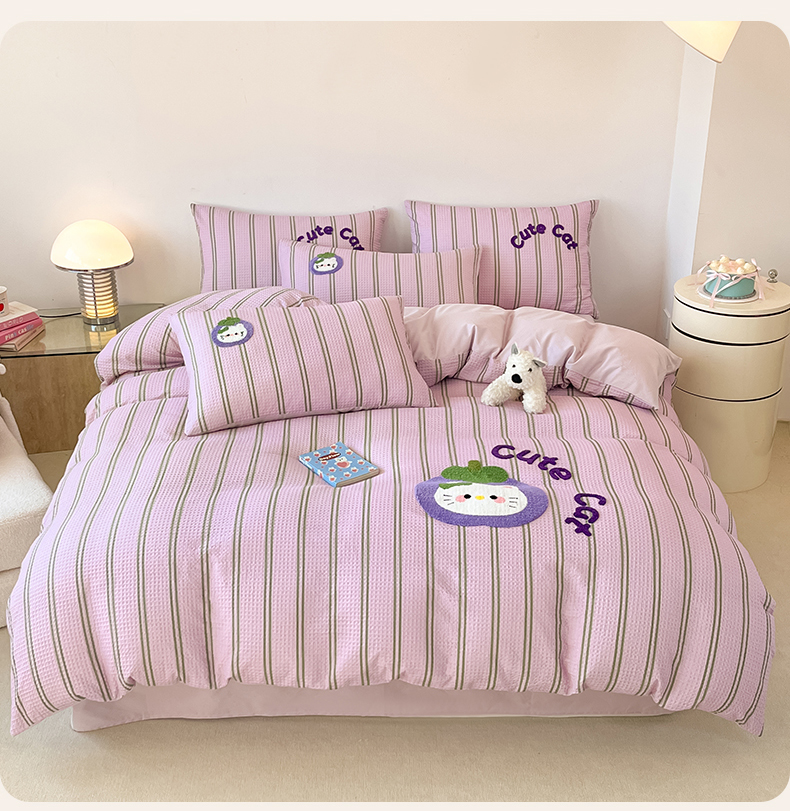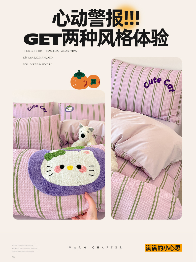 笙意家纺 2026新款全棉A版华夫格B版40支毛巾绣四件套 山竹小猫