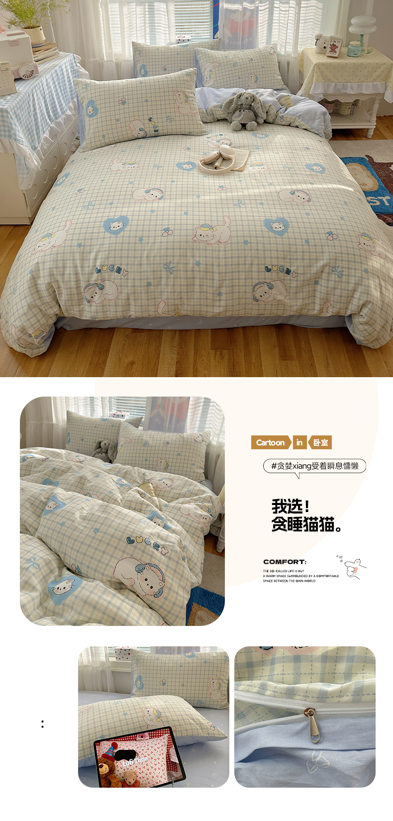 (总)雅居纺家纺 2026新款全棉卡通印花可爱小猫四件套,快乐小猫,爱心小猫,粉点猫咪,假日小猫,菱形格猫咪,猫咪伙伴