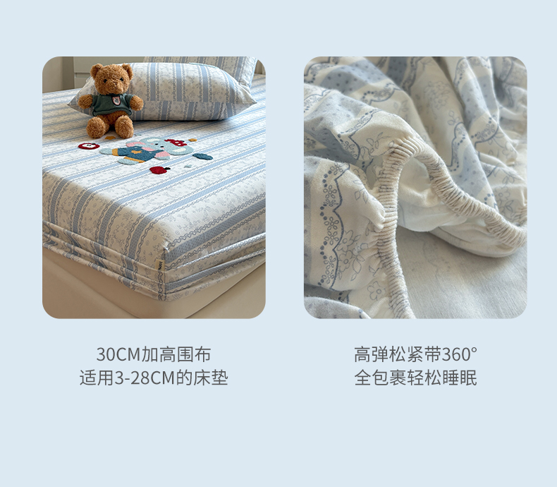 商品名称:居眠 2026新款全棉磨毛毛巾绣床笠 海盐蓝-狗狗-床笠