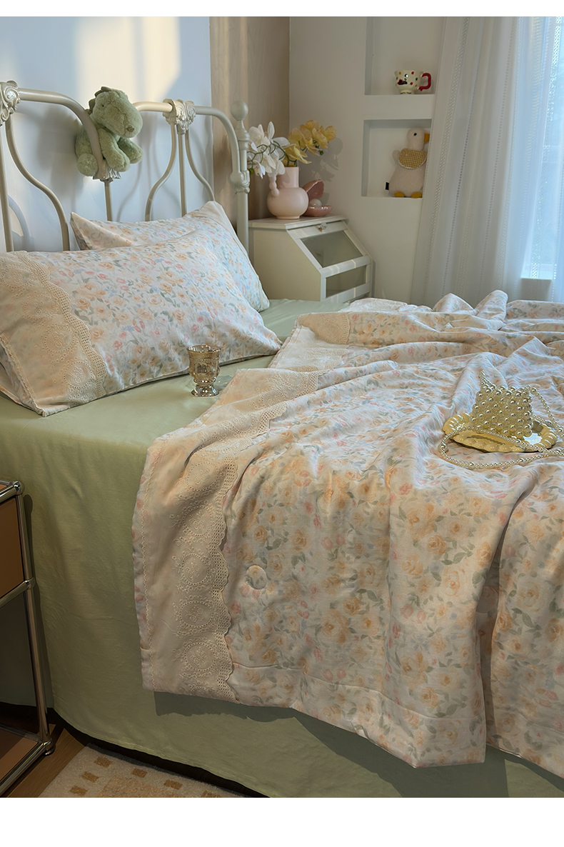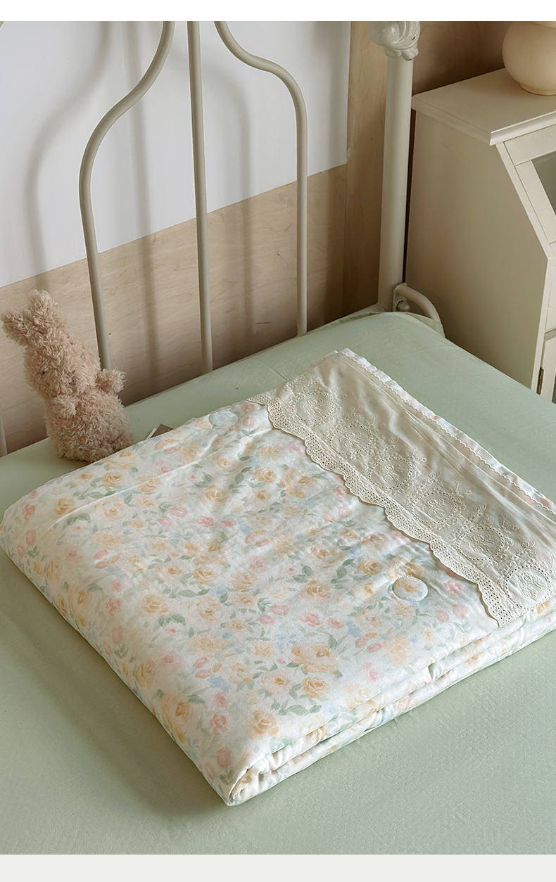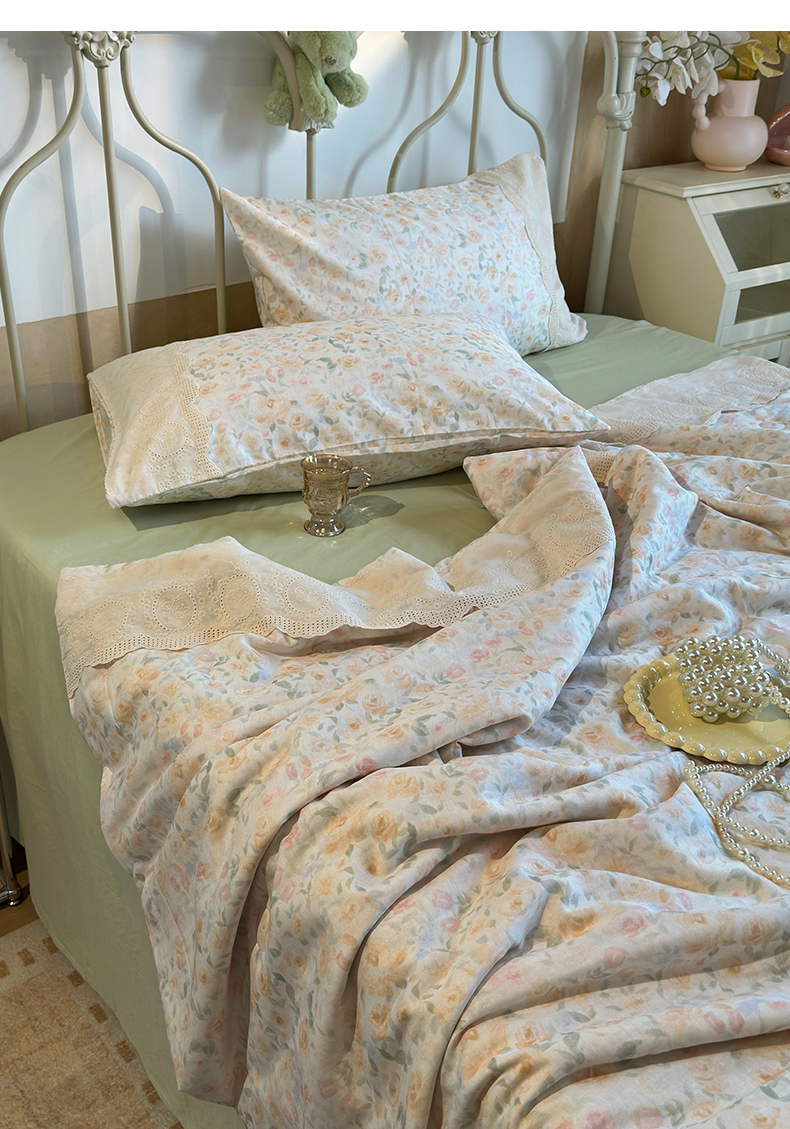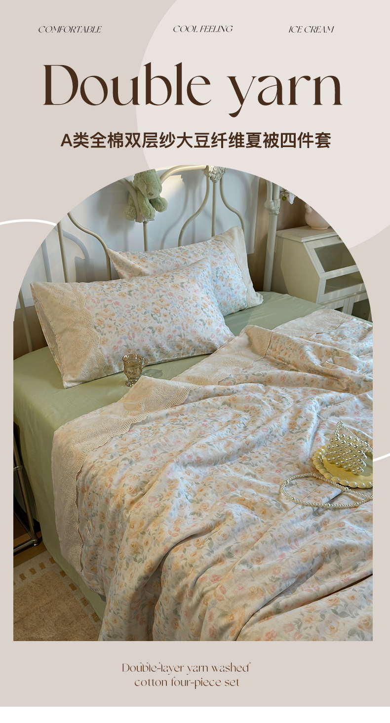 当前位置: 91家纺网 > 商品网购 > 床品套件 > 四件套 > 夏被四件套 > 绫韵家纺 2026夏季新品A类全棉双层纱法式大花边夏被四件套 月朦胧·黄