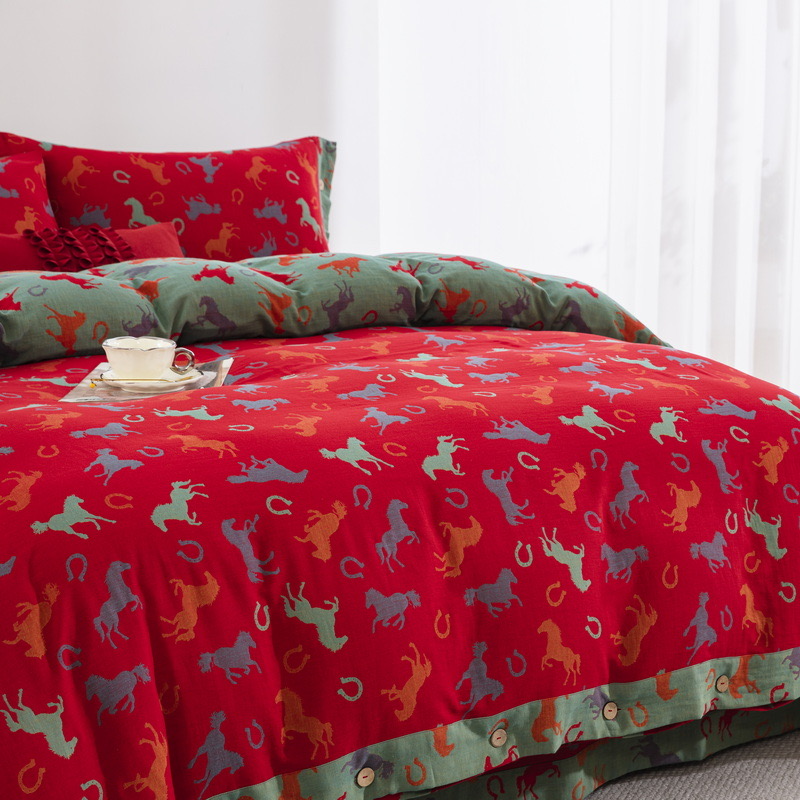 (总)双层纱家居 2026新款全棉纯棉色织提花拼角飞边款四件套-郁金花园正红,郁金花园正红