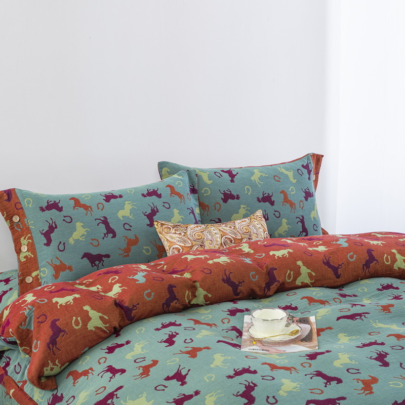 双层纱家居 2026新款马上有钱全棉纯棉色织提花双层纱纽扣款四件套 马上有钱-蓝白