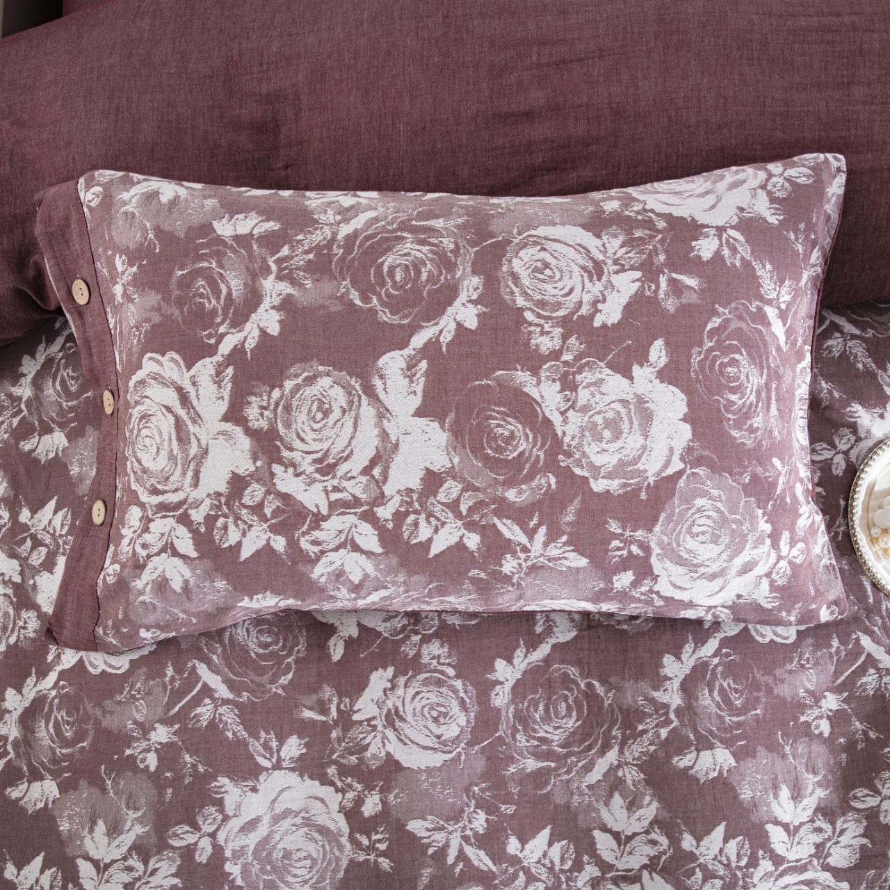 商品名称:双层纱家居 2026新款全棉纯棉色织提花纽扣款四件套-玫瑰庄园 玫瑰庄园-豆沙