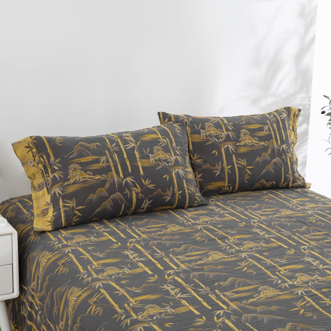 (总)双层纱家居 2026新款竹报平安全棉纯棉色织提花双层纱纽扣款四件套