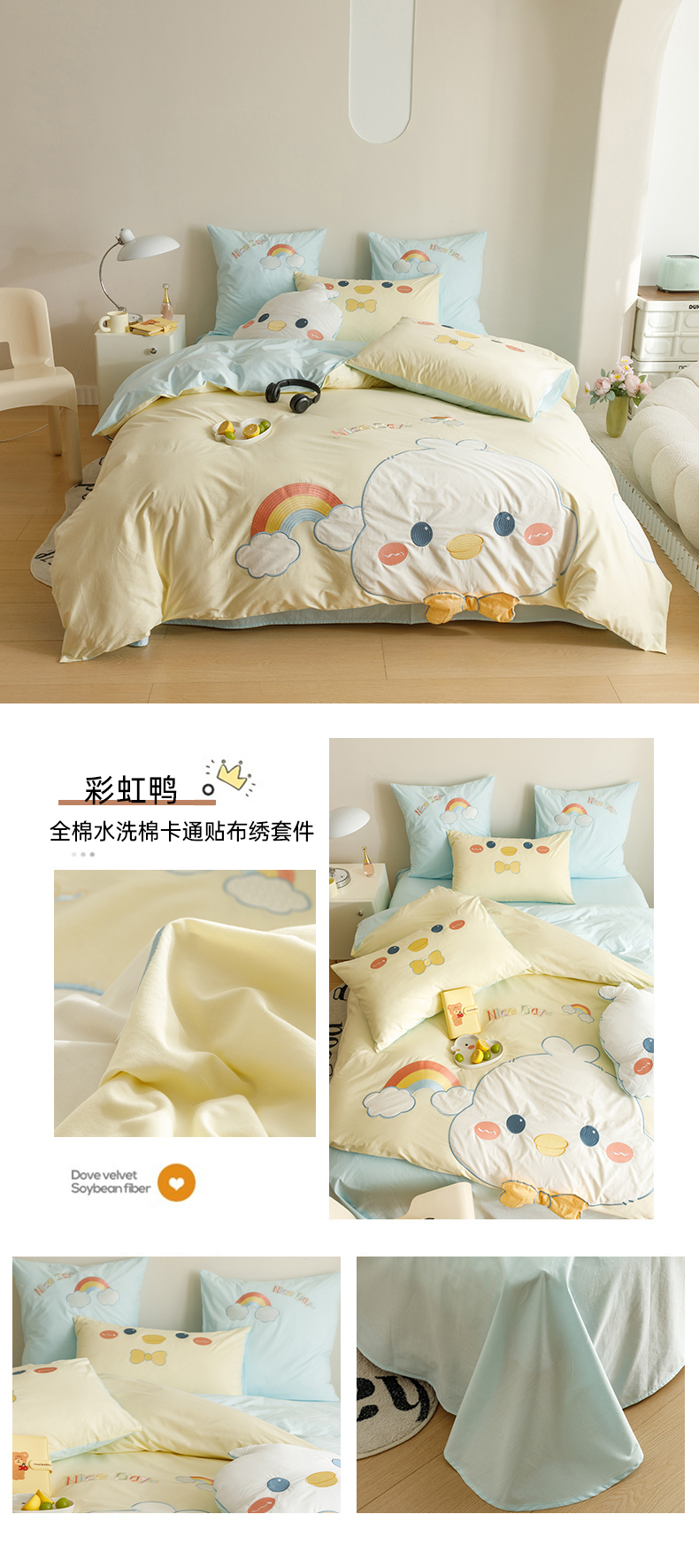 (总)2025款A类全棉水洗棉贴布绣四件套全棉卡通儿童三件套公主上下铺床套件,彩虹鸭,开心芝士,小鳄莱莱,宇航梦,长耳兔