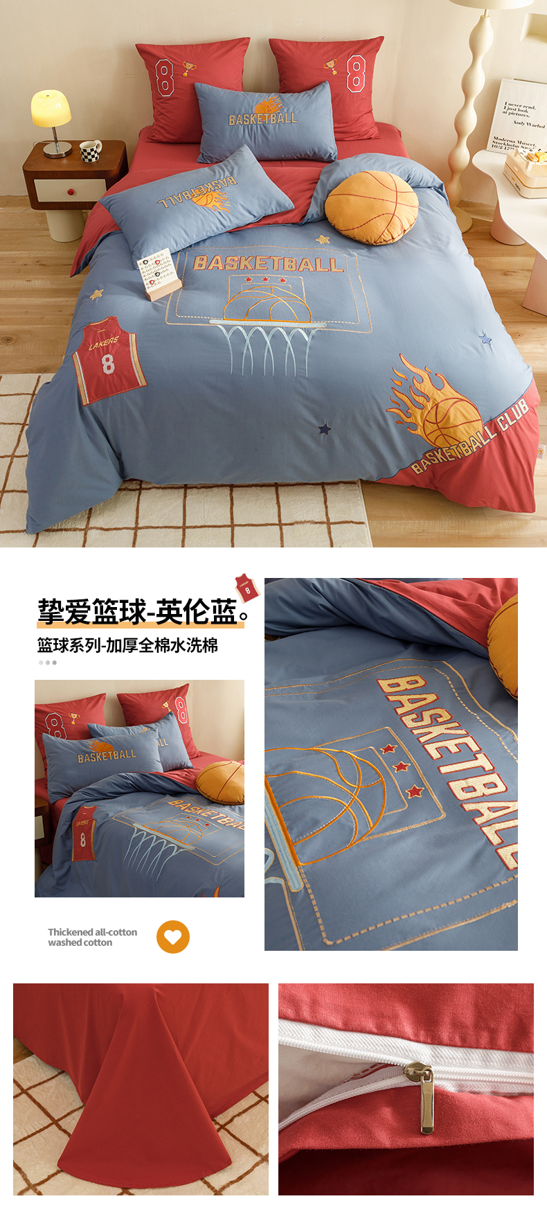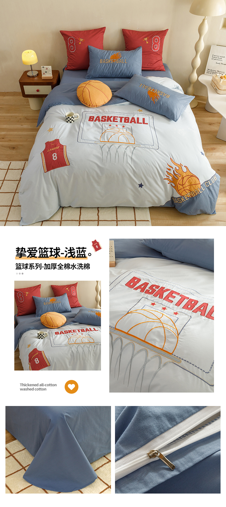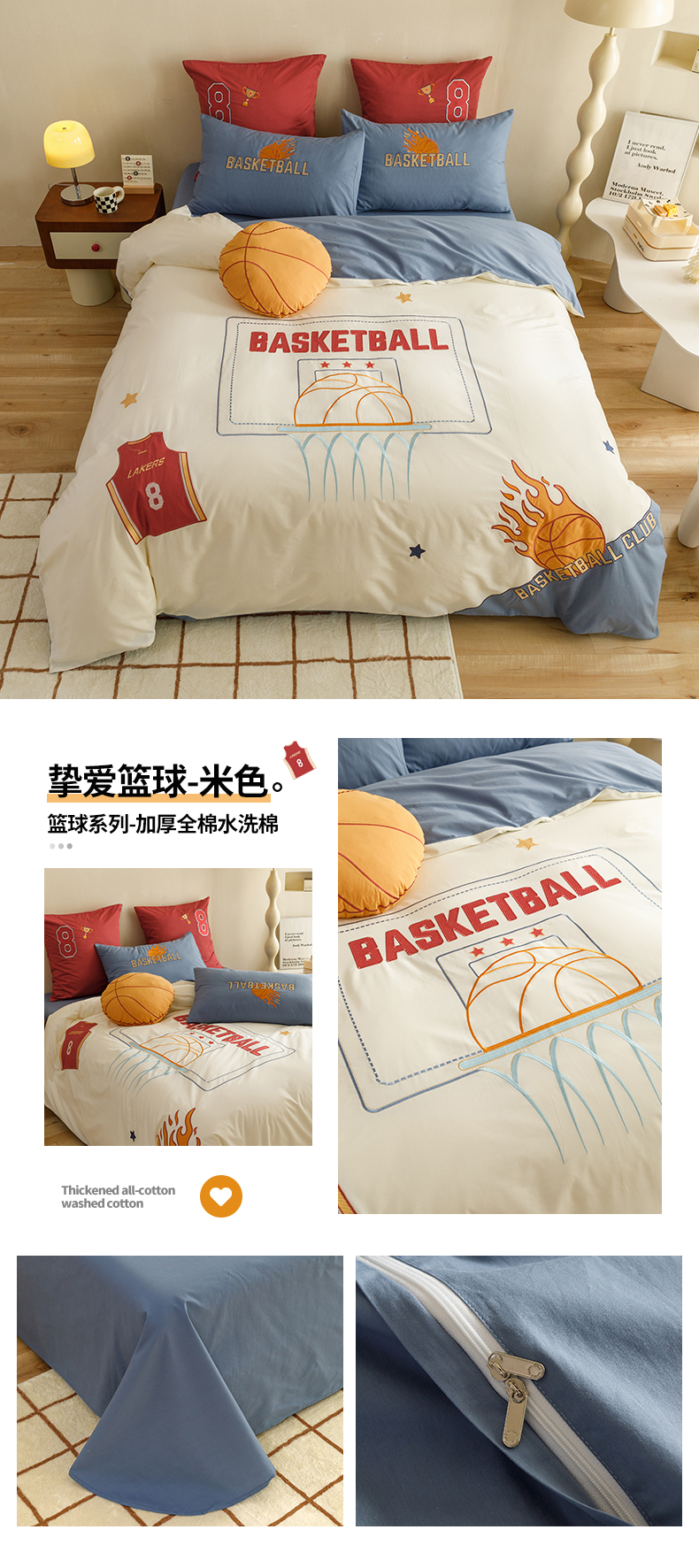 (总)绒梦里2025款A类纯棉水洗棉贴布绣四件套全棉卡通儿童三件套上下铺床套件--篮球系列,挚爱篮球-米色,挚爱篮球-浅蓝,挚爱篮球-英伦蓝