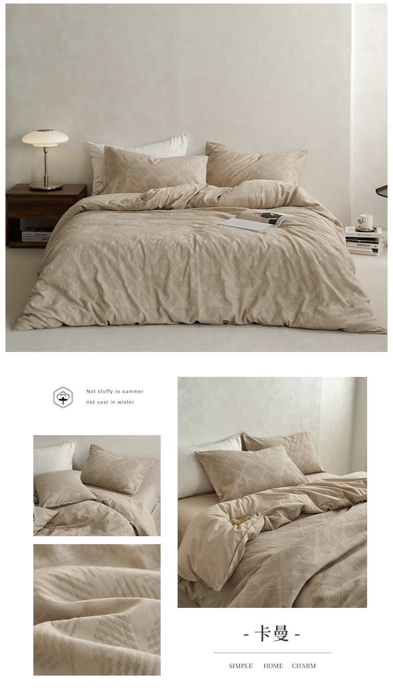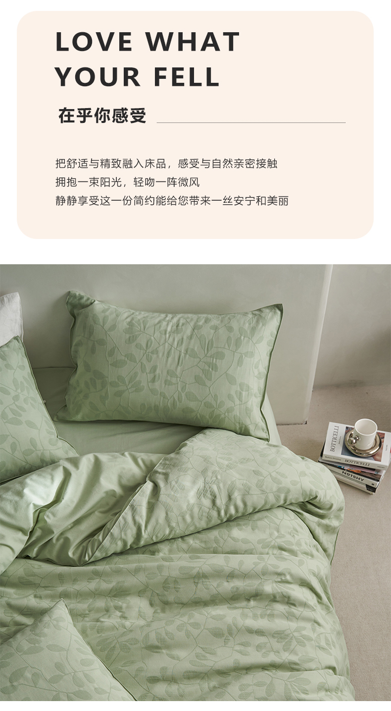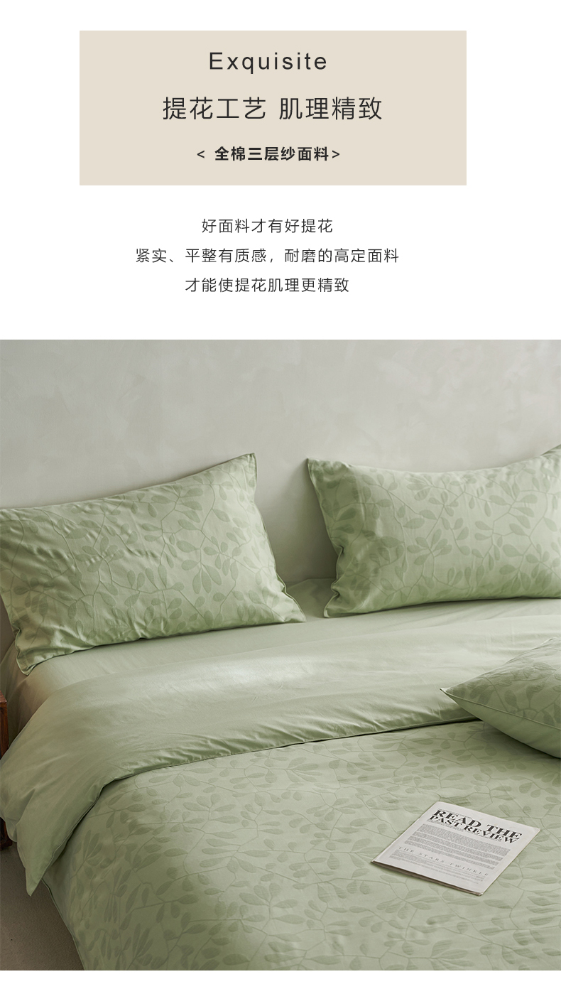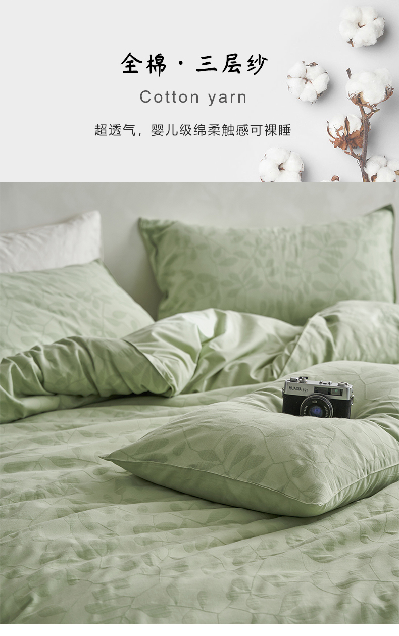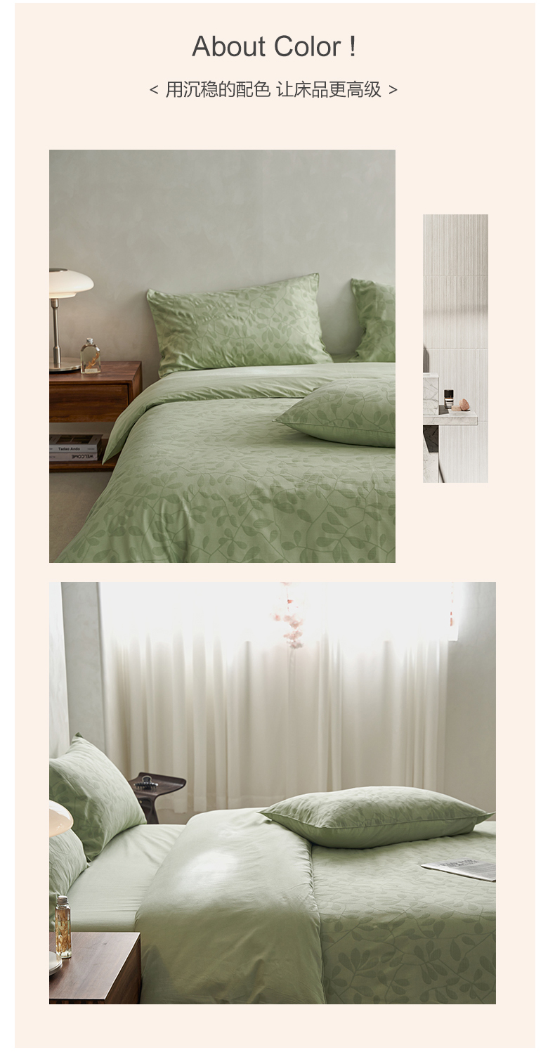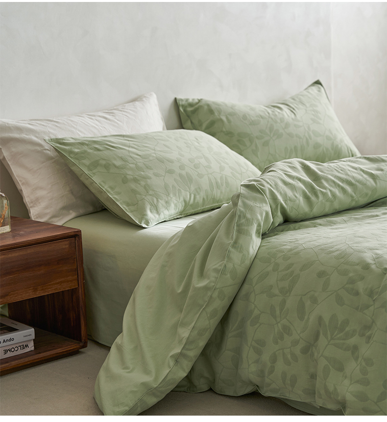 当前位置: 91家纺网 > 商品网购 > 床品套件 > 四件套 > 全棉普通四件套 > 宜代光年 2026新款全棉纯棉60S水洗棉三层纱色织提花四件套系列(经典保留花型) 叶繁-绿