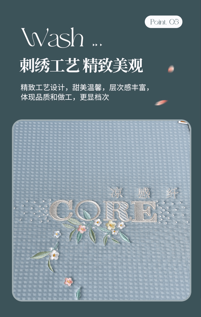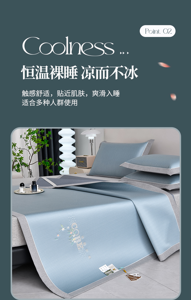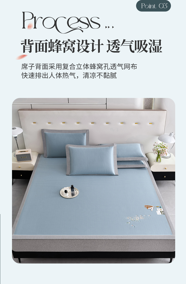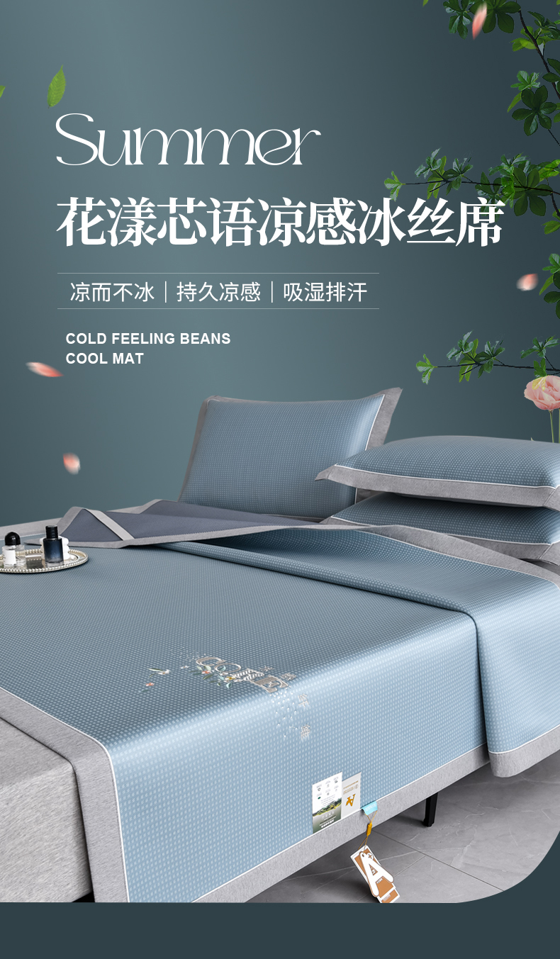 商品名称:小牛席业 2026新款花漾芯语绣花凉感冰丝席系列凉席藤席冰藤席冰丝席草席竹席乳胶席凉感豆豆席 蓝色