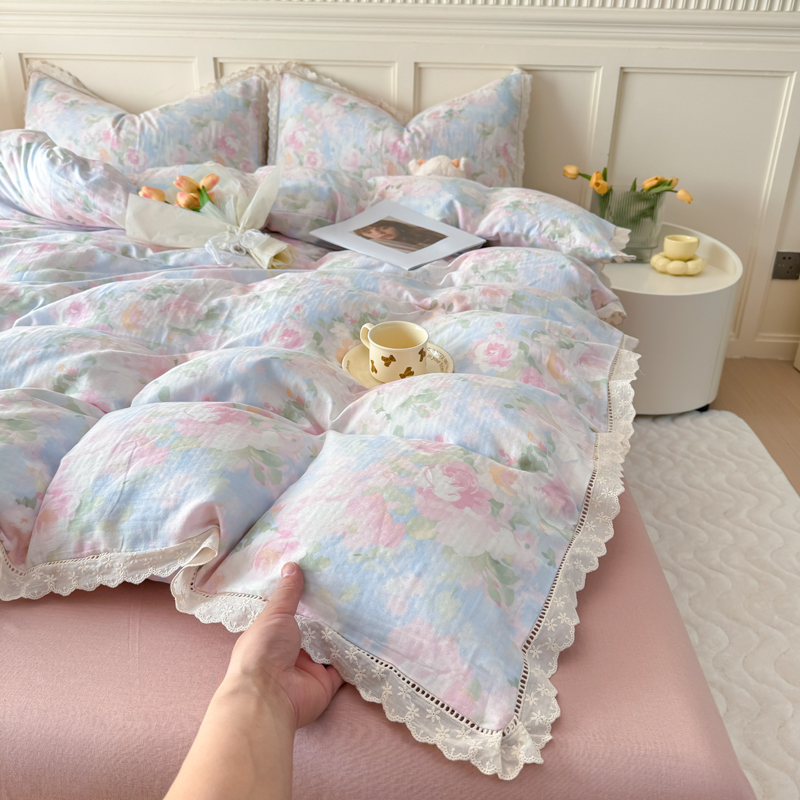 当前位置: 91家纺网 > 商品网购 > 床品套件 > 四件套 > 全棉普通四件套 > 疆东 【疆东】2026韩版蕾丝花边纯棉全棉双层纱四件套印花纯棉四件套法式赫本木耳花边全棉公主双层纱四件套 波纹
