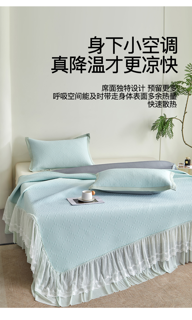 (总)航途席业 2026新款A类凉感豆豆床裙款凉席三件套-系列六,薄荷菱格,冰蓝回韵,蓝纱叶羽,浅青回韵,青纱叶羽,烟灰菱格,月灰回韵