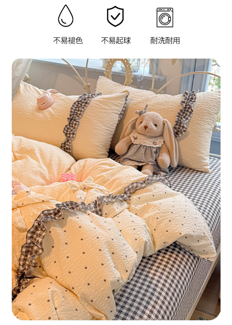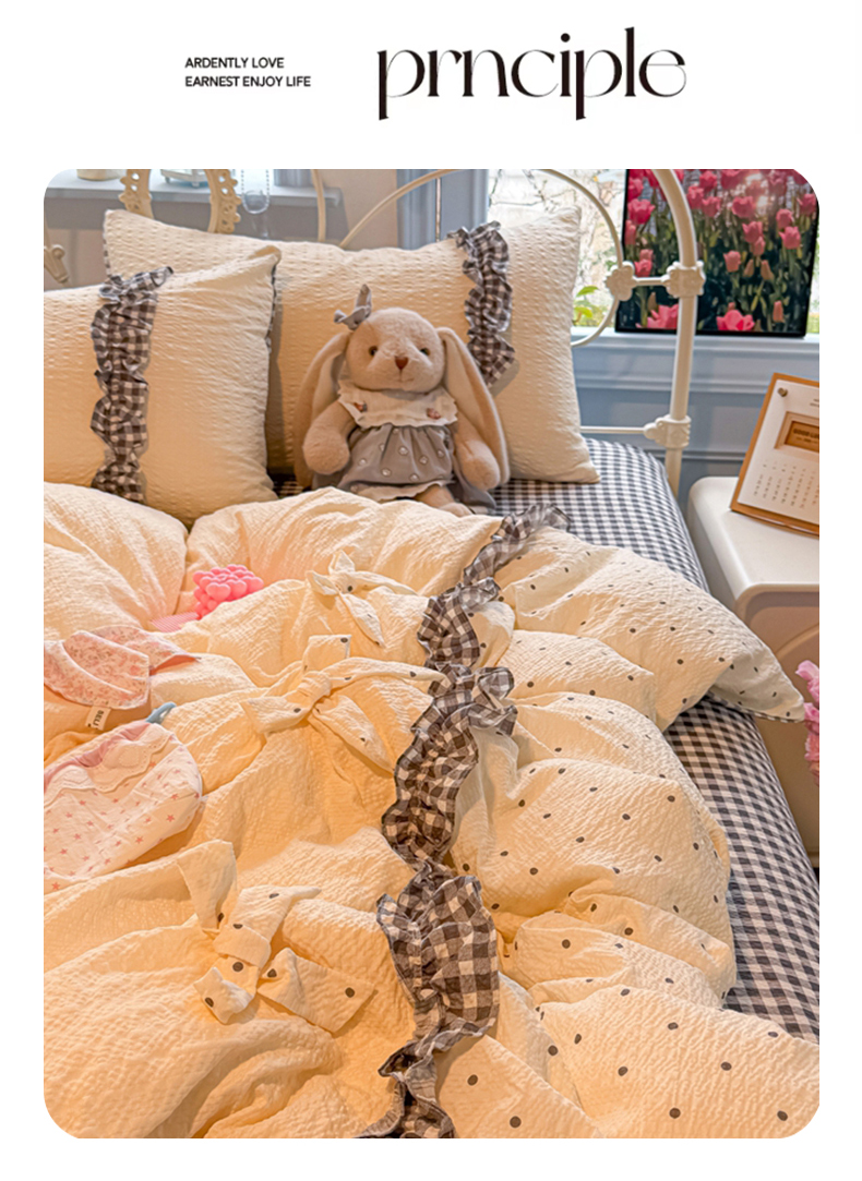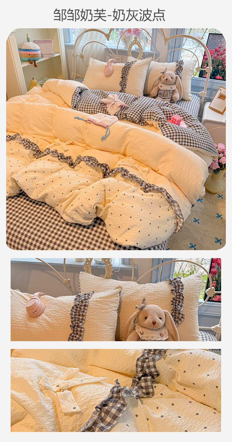 当前位置: 91家纺网 > 商品网购 > 床品套件 > 四件套 > 化纤普通四件套 > 子钦家纺 2026春夏新款提花泡芙棉甜系格子软乎乎的治愈床品花边蝴蝶结床单床笠四件套-邹邹奶芙 邹邹奶芙-奶灰波点