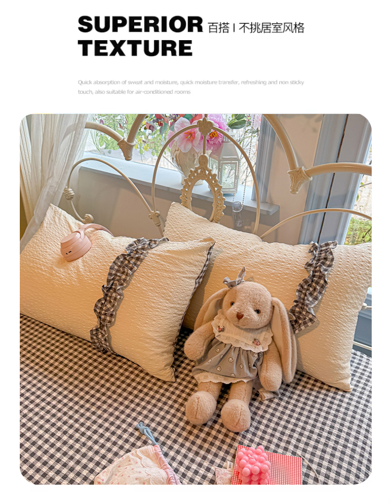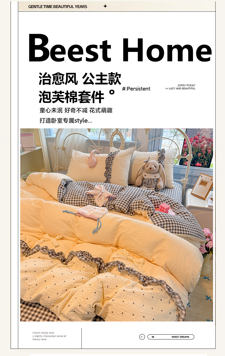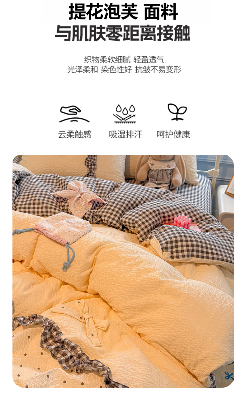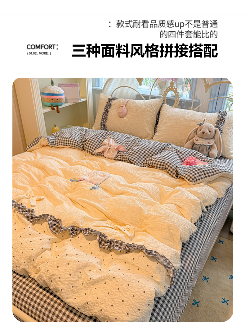 当前位置: 91家纺网 > 商品网购 > 床品套件 > 四件套 > 化纤普通四件套 > 子钦家纺 2026春夏新款提花泡芙棉甜系格子软乎乎的治愈床品花边蝴蝶结床单床笠四件套-邹邹奶芙 邹邹奶芙-奶灰波点