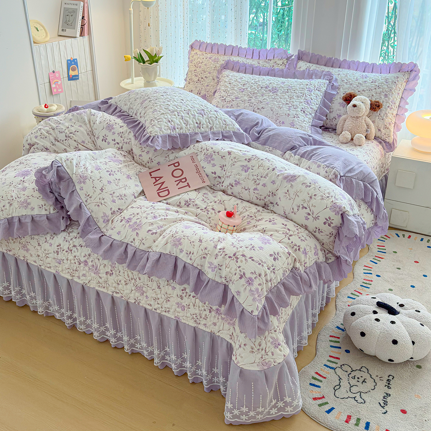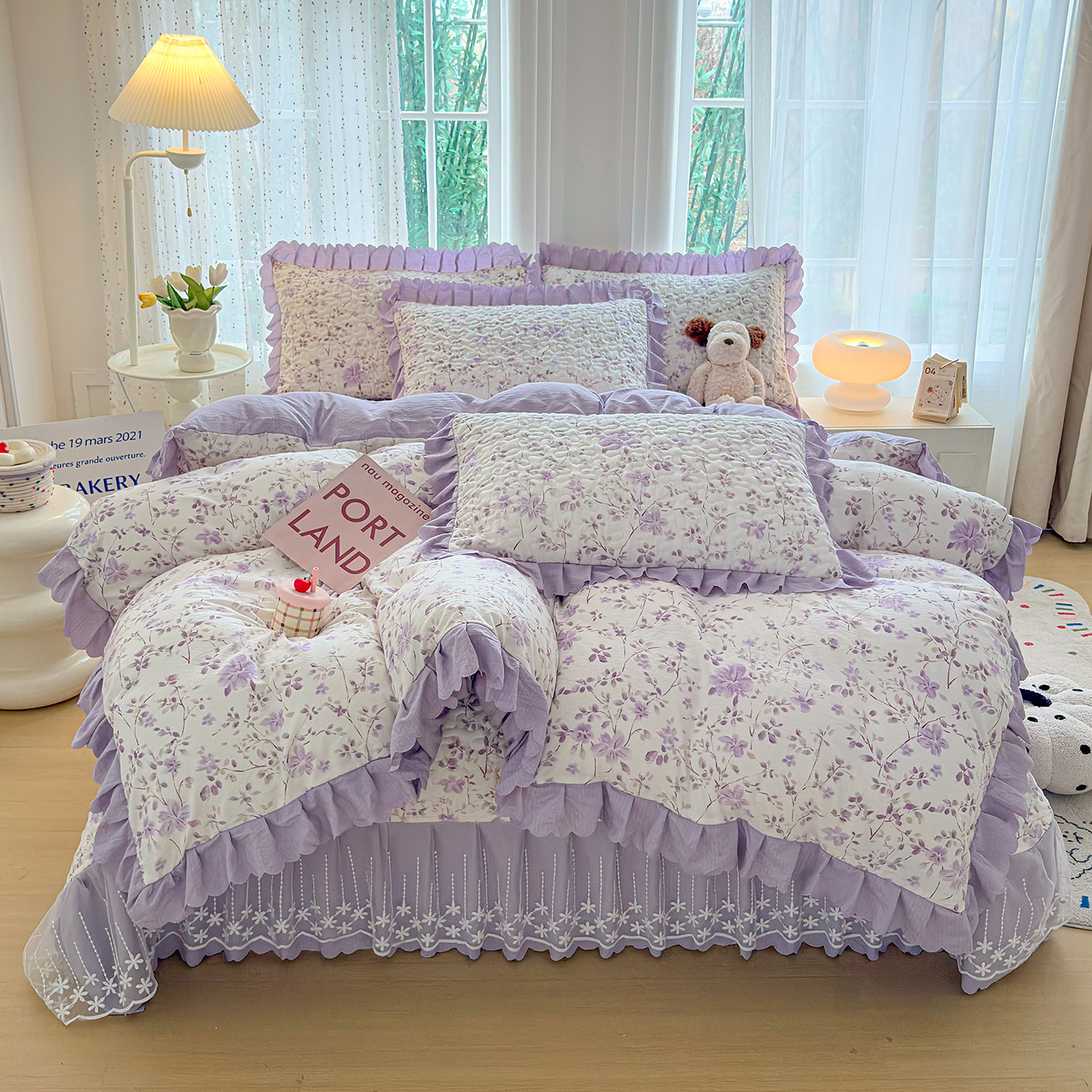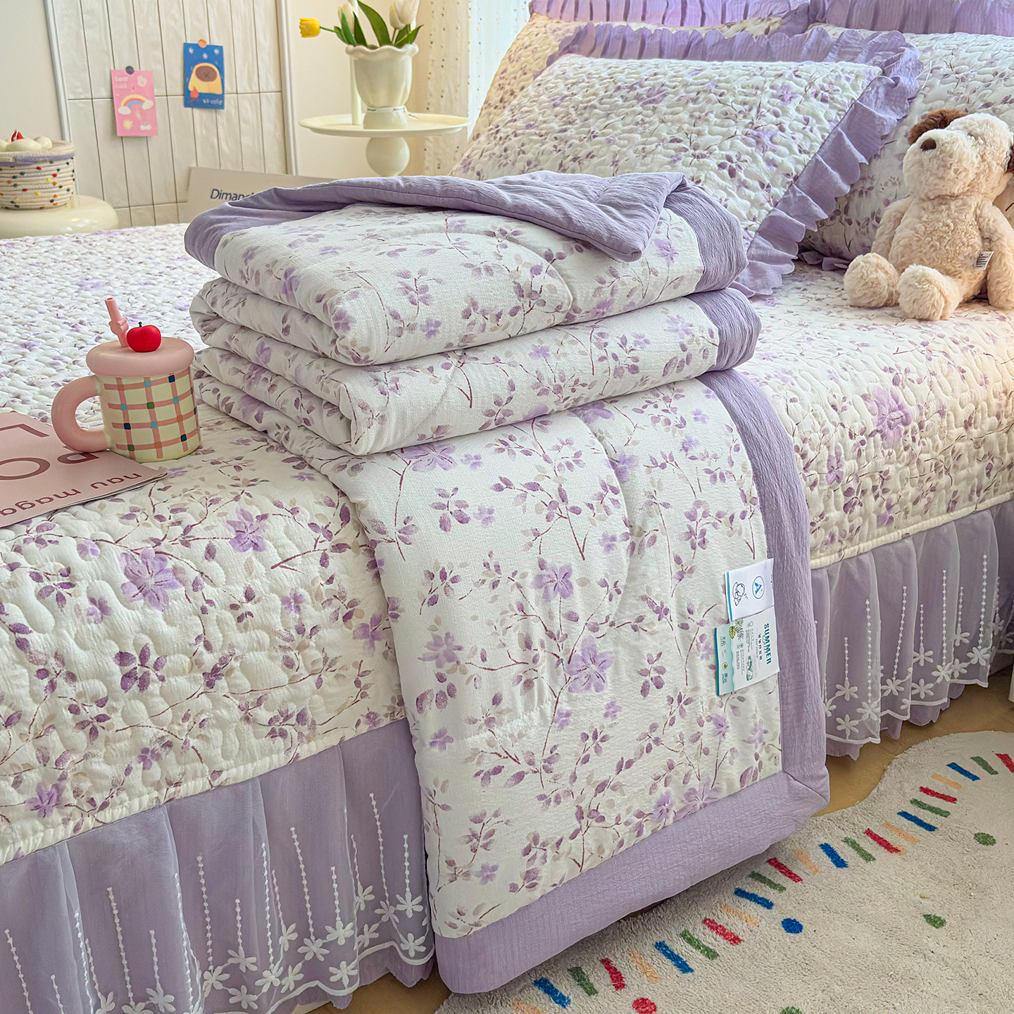 当前位置: 91家纺网 > 商品网购 > 床品套件 > 四件套 > 其它四件套 > 绒耀家纺 2026春夏直播爆款泡芙棉云感双层纱皱皱纱韩式花边床盖四件套 紫薇