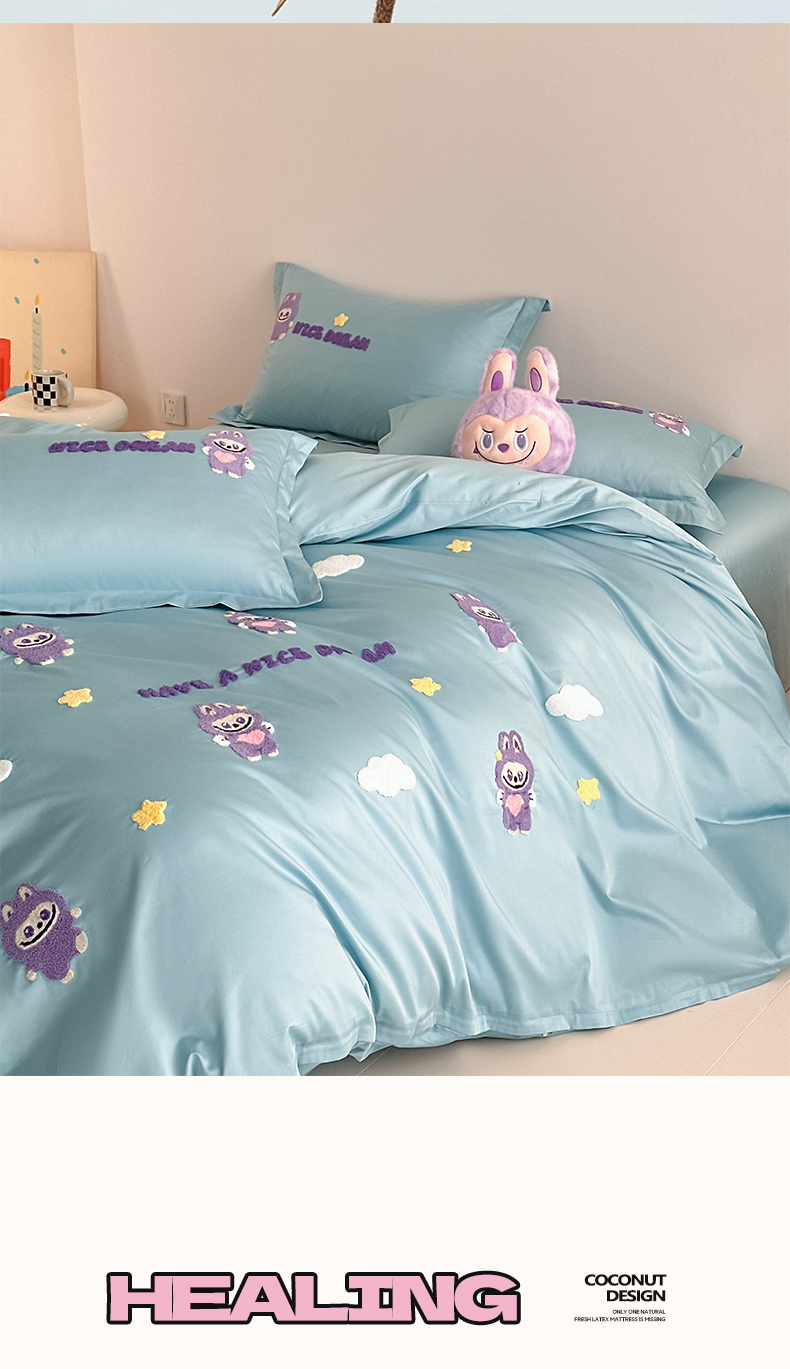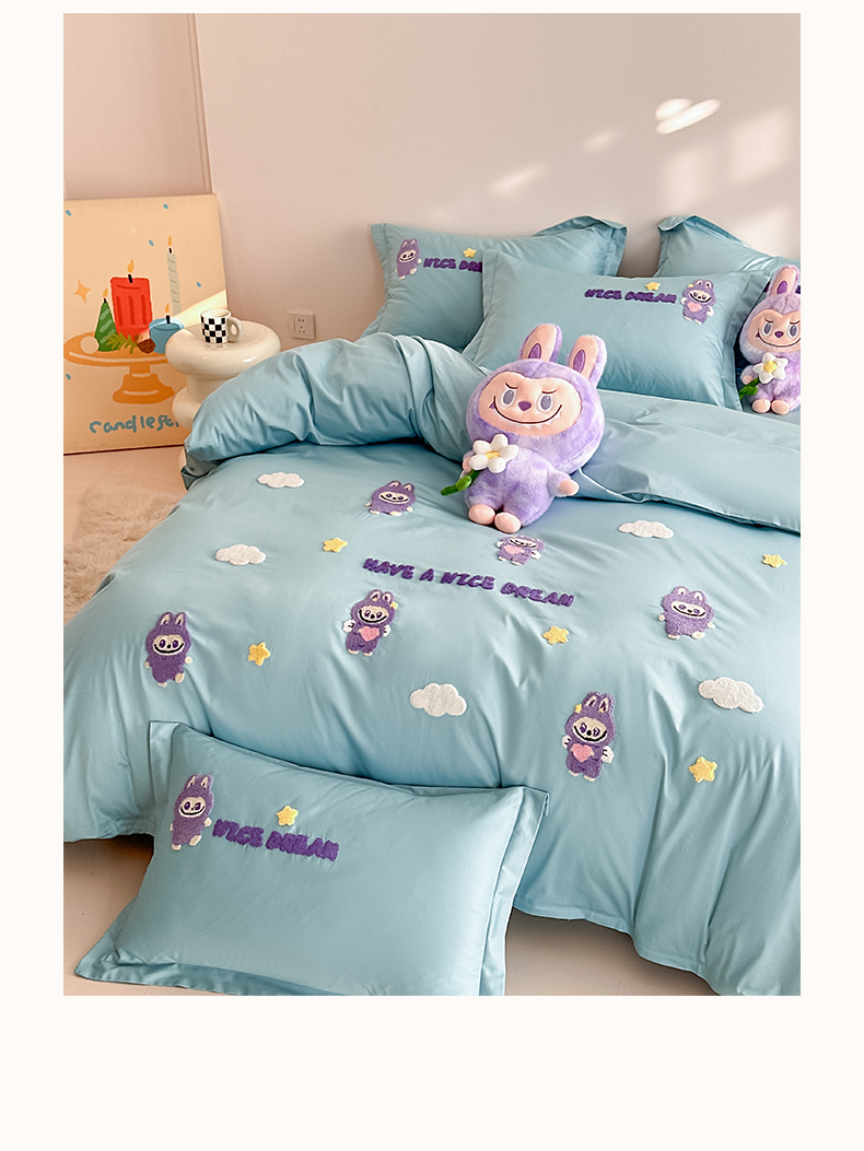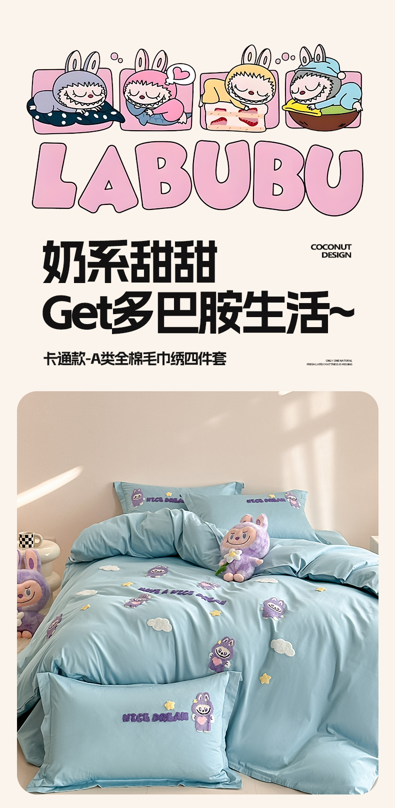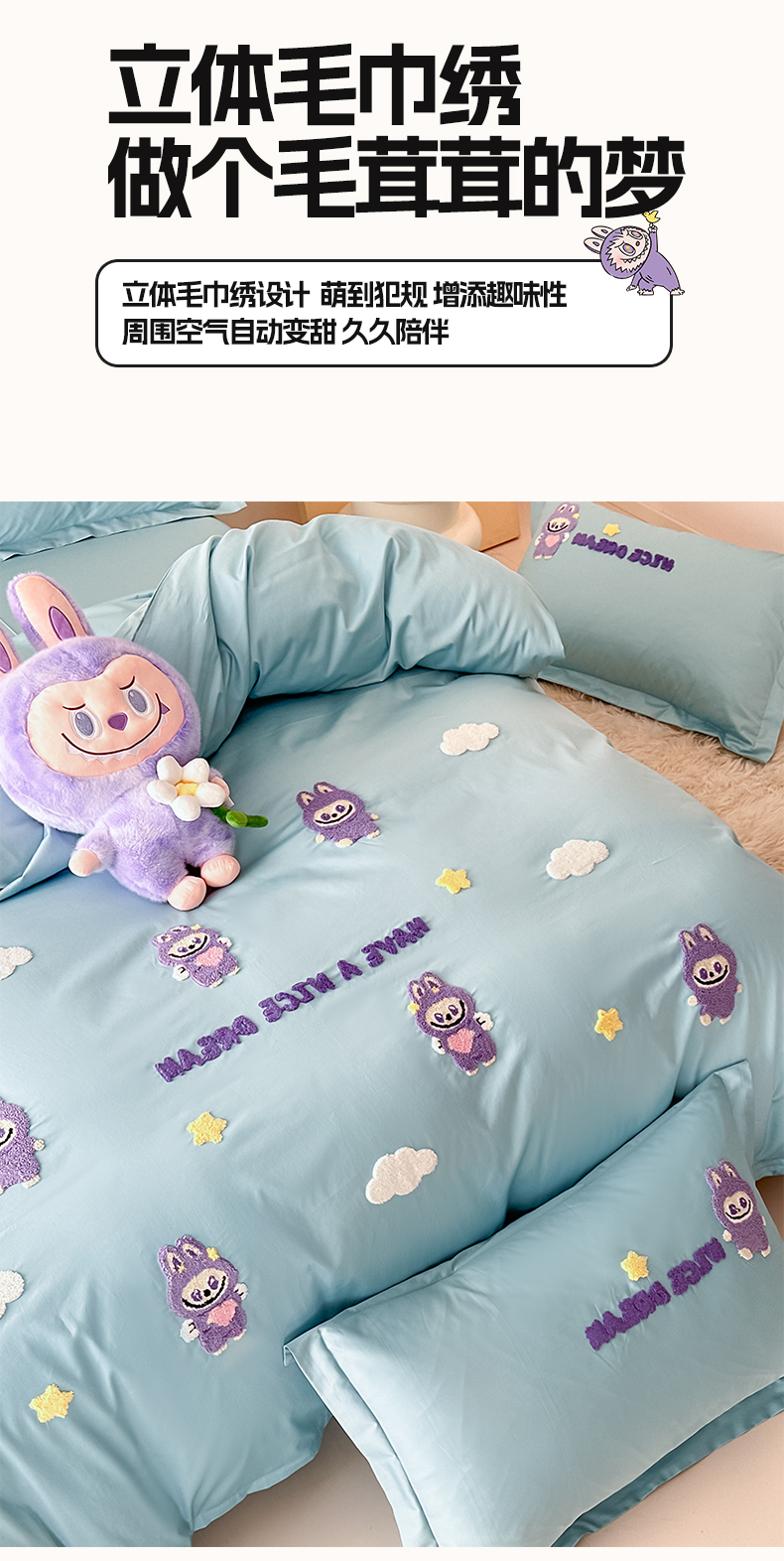 当前位置: 91家纺网 > 商品网购 > 床品套件 > 四件套 > 全棉普通四件套 > 犇牛仓储供应链 2026春夏新款A类全棉纯棉毛巾绣卡通款四件套拉布布 拉布布-蓝