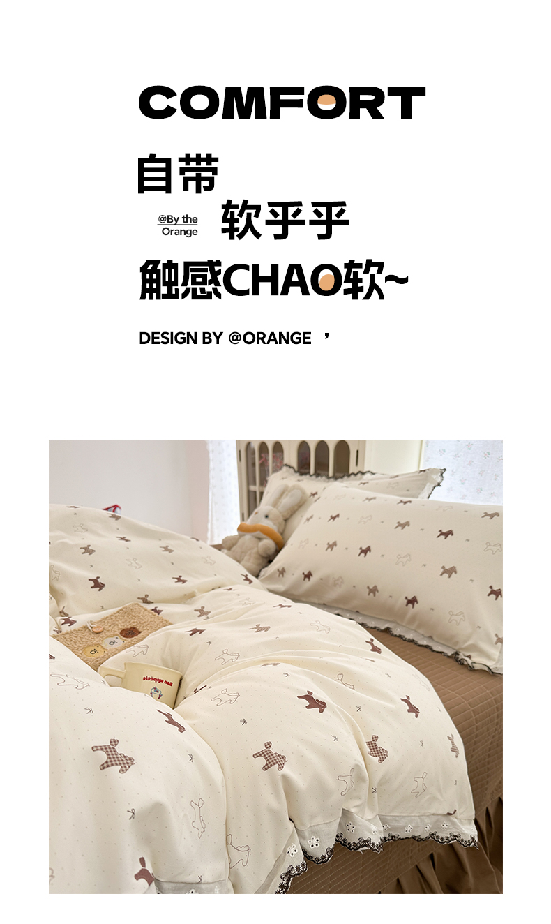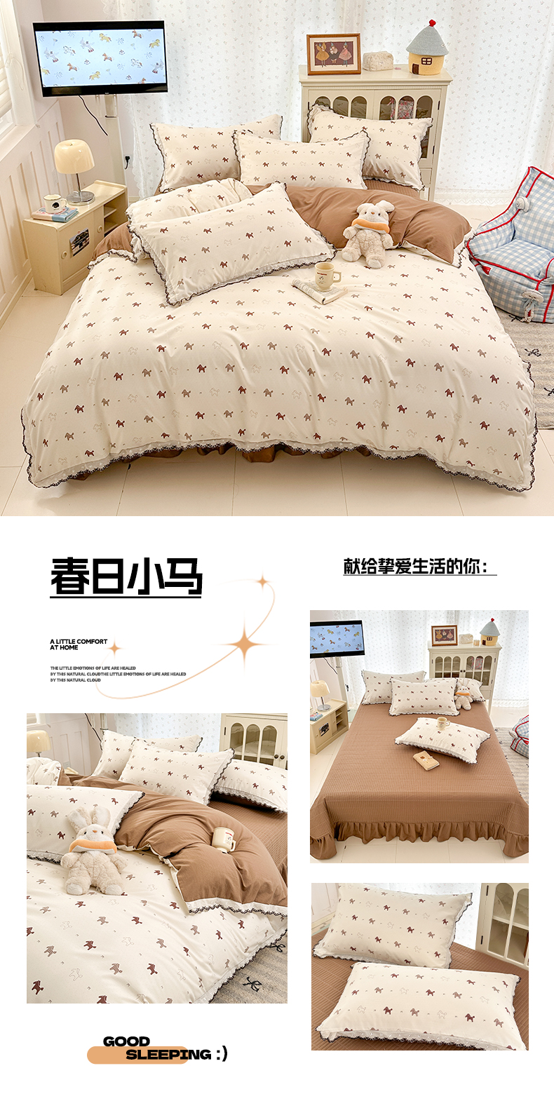 (总)莱米家纺 2026春夏新款亲肤花边全棉床盖四件套,春日小马,花团锦簇,花园小狗,苹果小熊,温柔蜜语-粉,温柔蜜语-蓝,小彩虹,紫韵