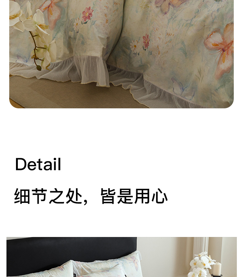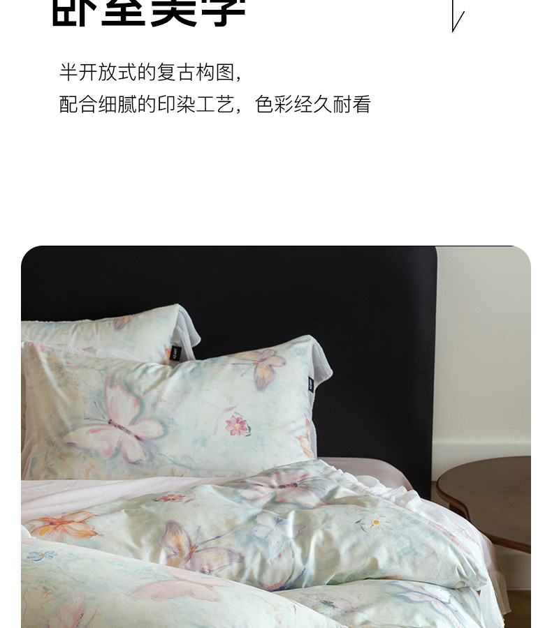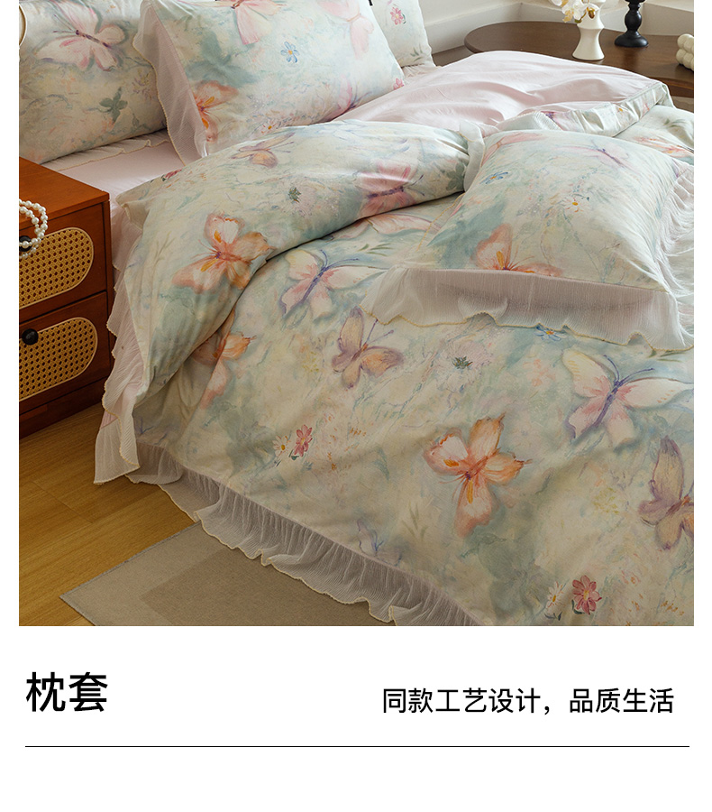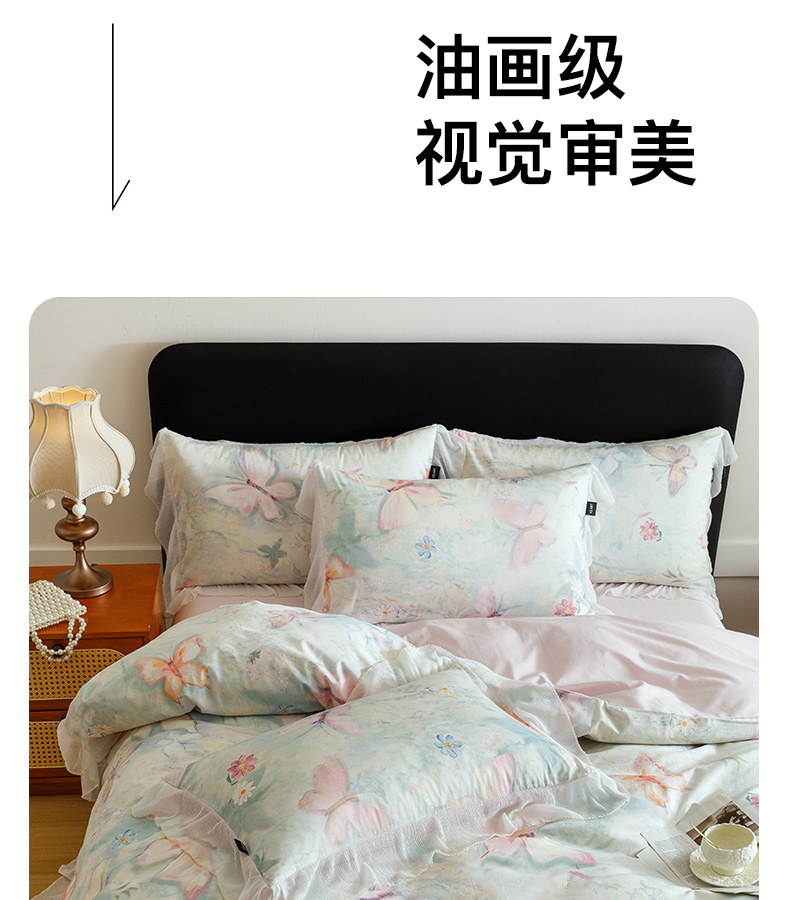 商品名称:卡姿家纺 2026春夏全棉法式复古油画风花边款四件套 假日蝶梦