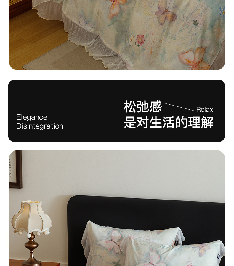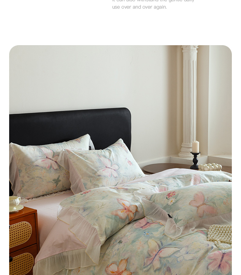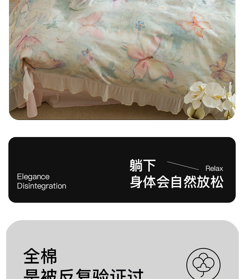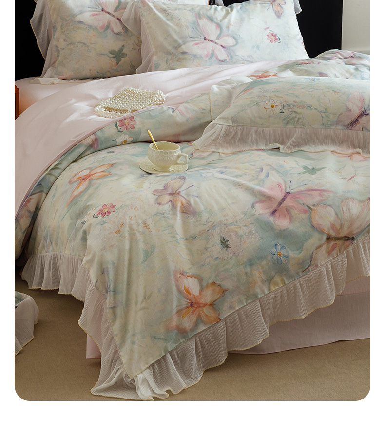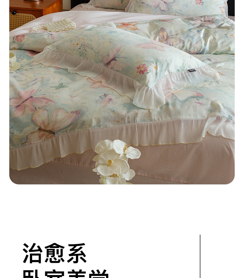 商品名称:卡姿家纺 2026春夏全棉法式复古油画风花边款四件套 假日蝶梦