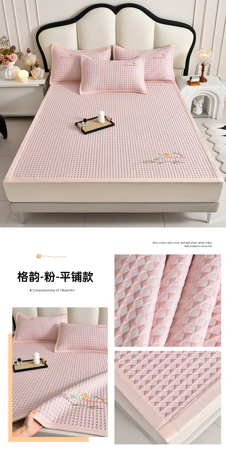 (总)梦之星 2026新款PE凉感豆豆凉席绣花三明治复合三件套,格韵-粉-平铺款,格韵-灰-平铺款,格韵-蓝-平铺款,格韵-绿-平铺款