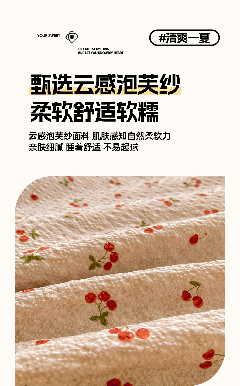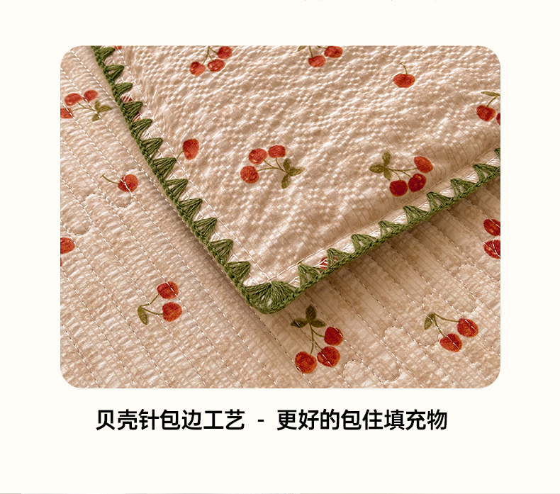 • 91家纺网 家纺一手货源 找家纺 梵朴 2026新款A类泡芙双层纱贝壳边床盖夏被四件套三角针夏凉被空调被 酒渍樱桃
