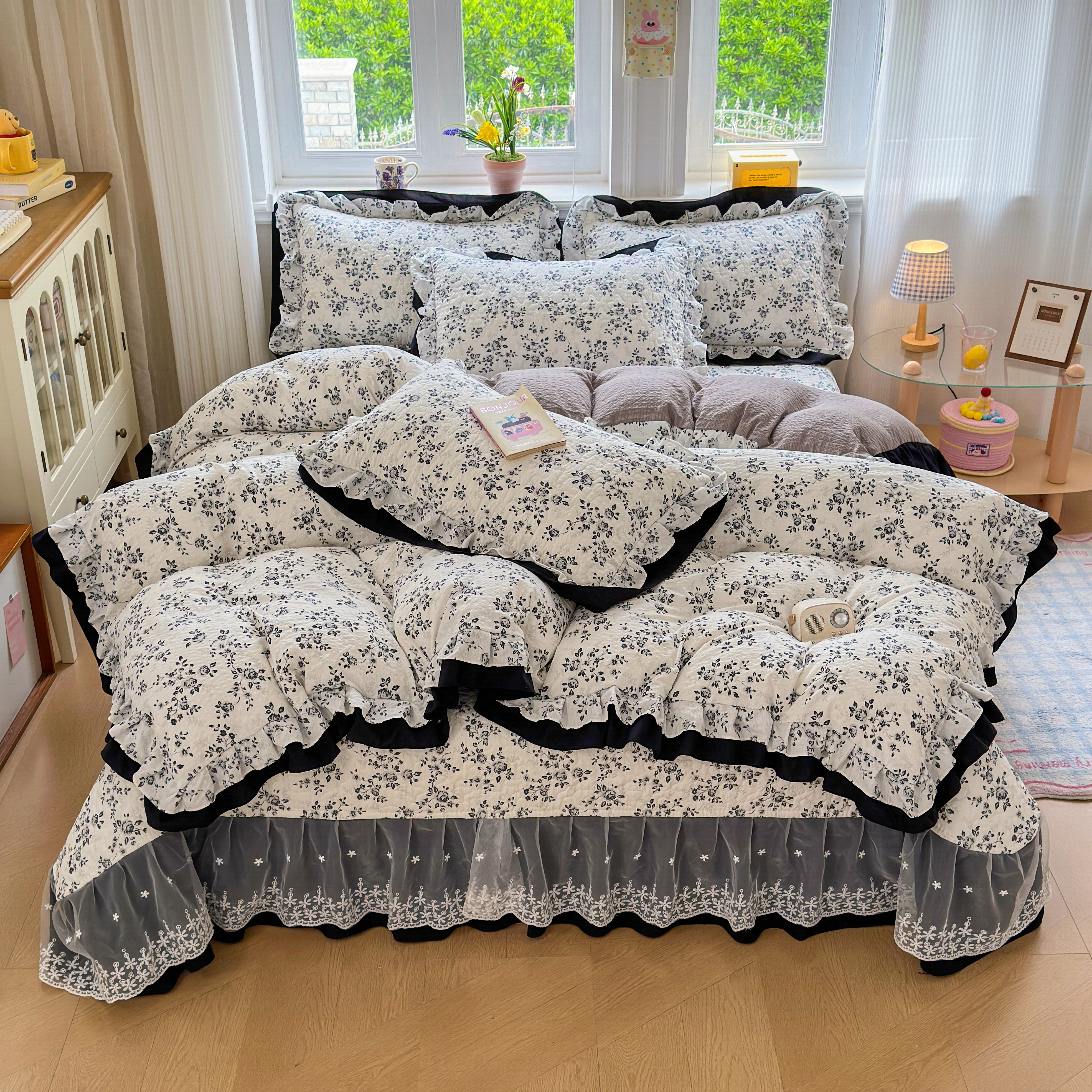 当前位置: 91家纺网 > 商品网购 > 床品套件 > 四件套 > 双层纱四件套 > 雅眠居 2026直播爆款泡芙双层纱蕾丝花边被套款床盖款四件套 粉薇