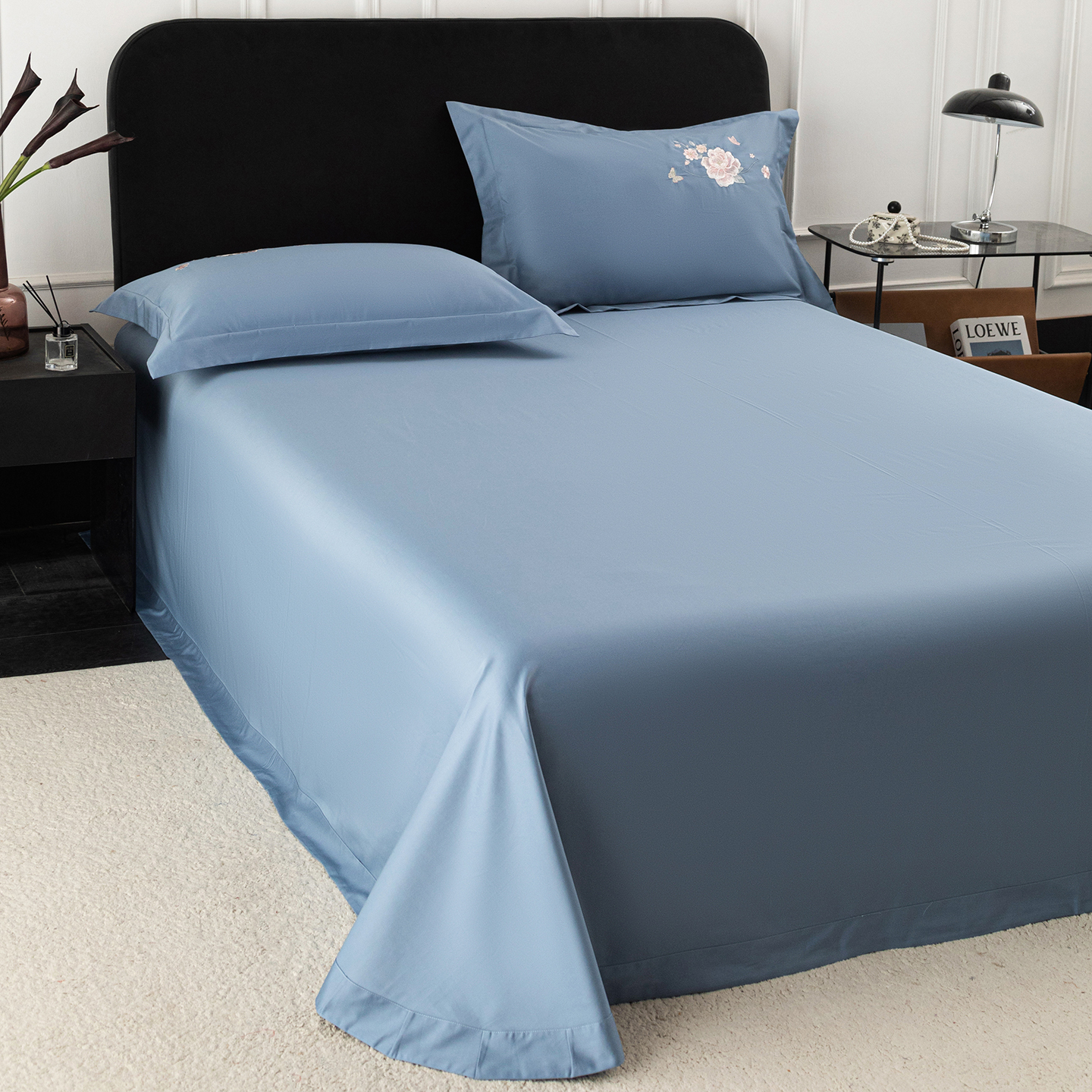 莉迪娅 2026新款50s双股长绒棉纯色简约绣花床单三件套--花开牡丹系列 海藻蓝牡丹