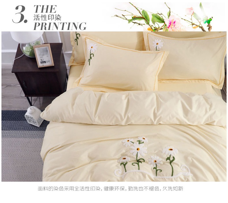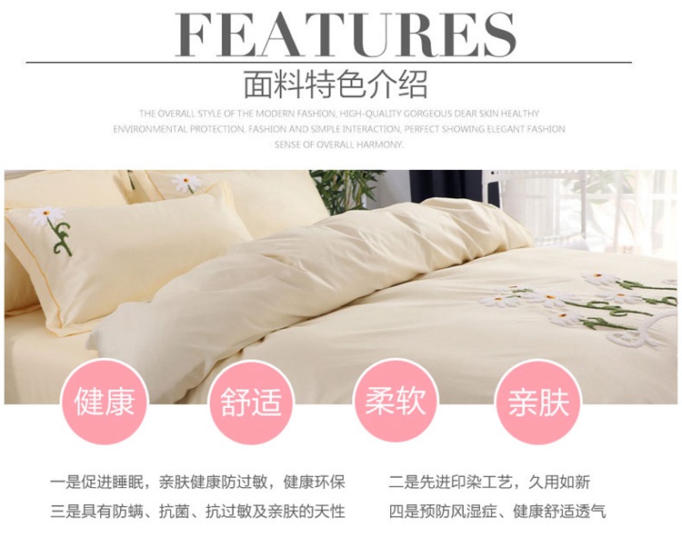 全棉133*72纯色绣花四件套,采用新疆精梳棉,60支纱,密度133*72。专版绣花花型设计,高精度、高密度立体毛巾绣工艺,相比普通绣花更加牢固不易脱线,美观又耐用。