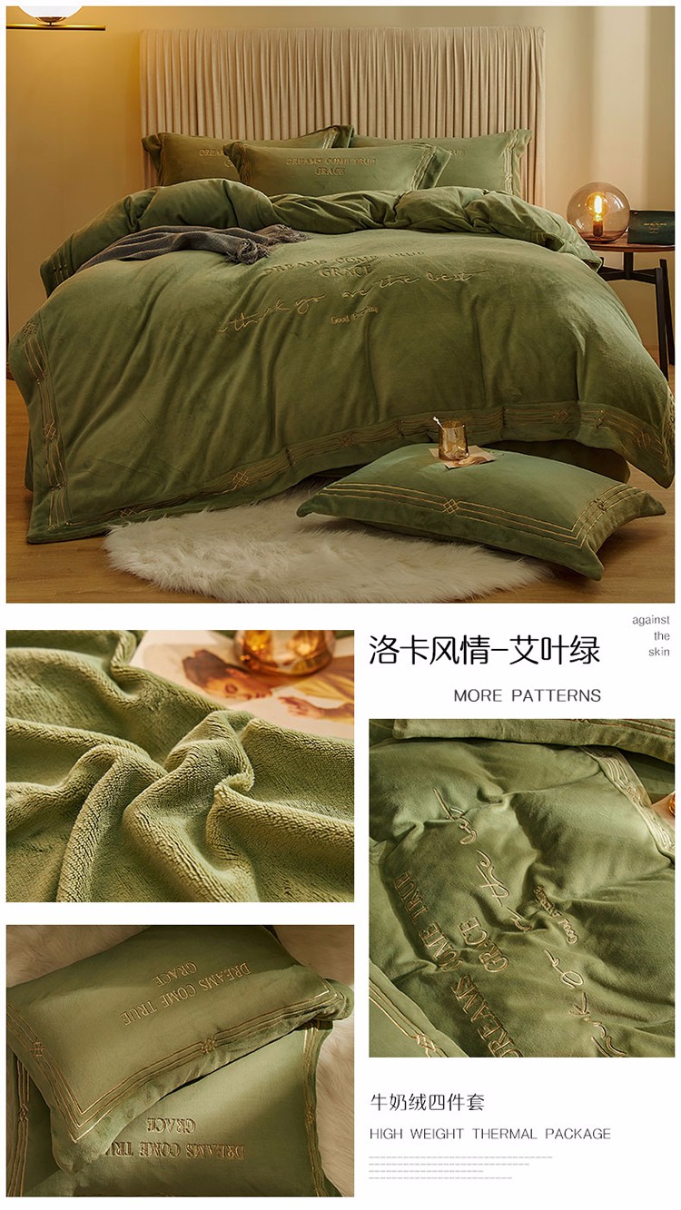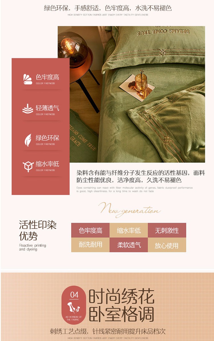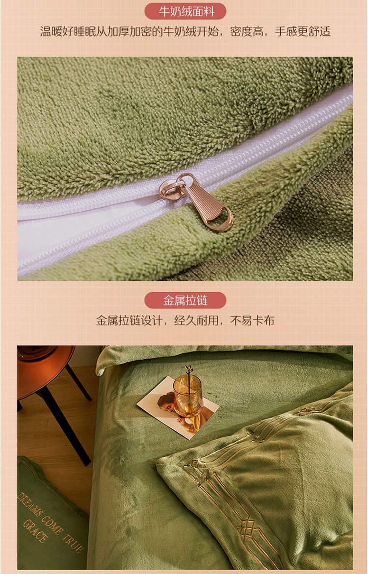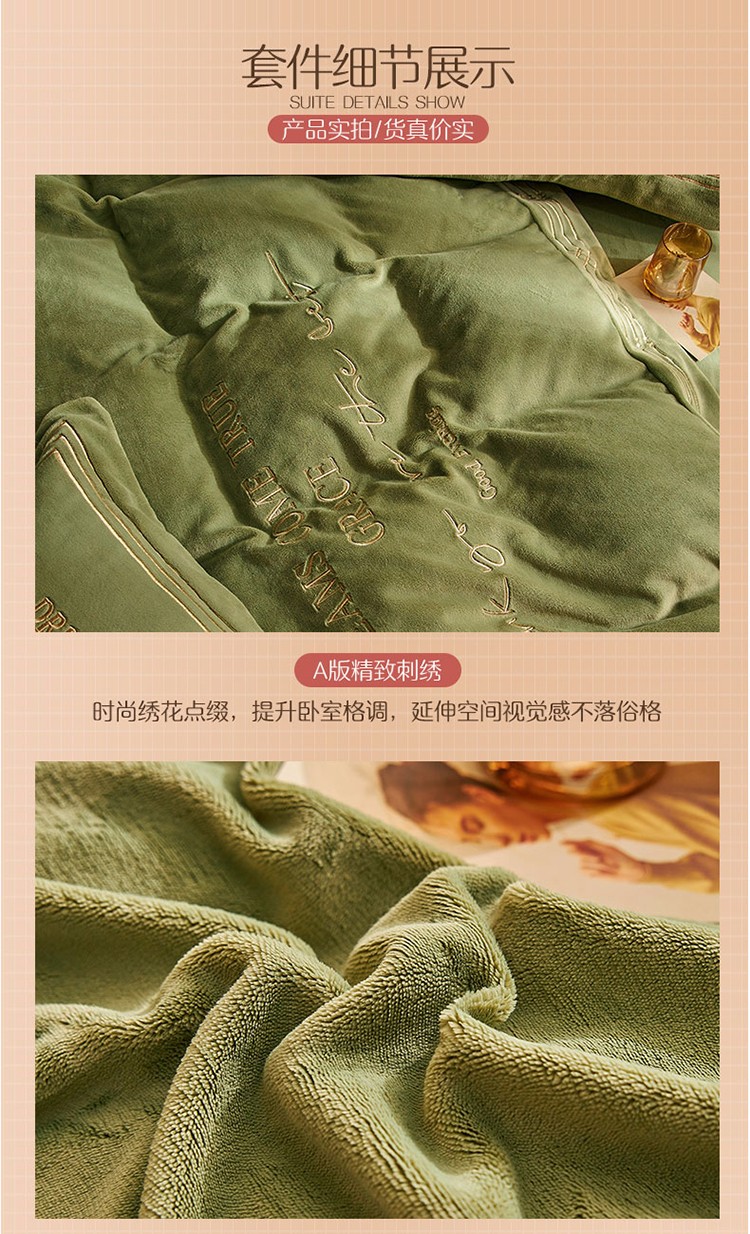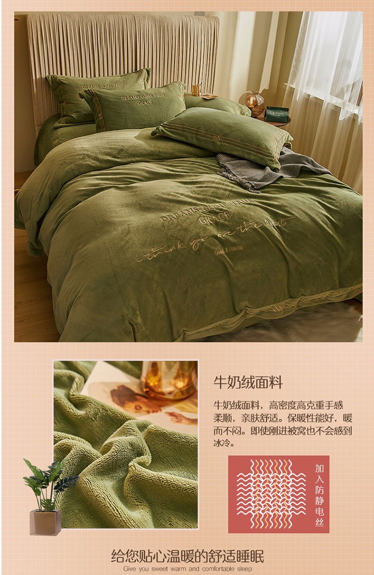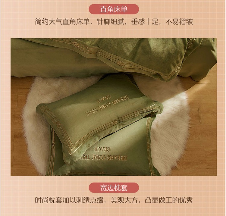 商品名称:米奈 2020新款水晶绒法莱绒牛奶绒绣边罗伊系列四件套 艾叶绿