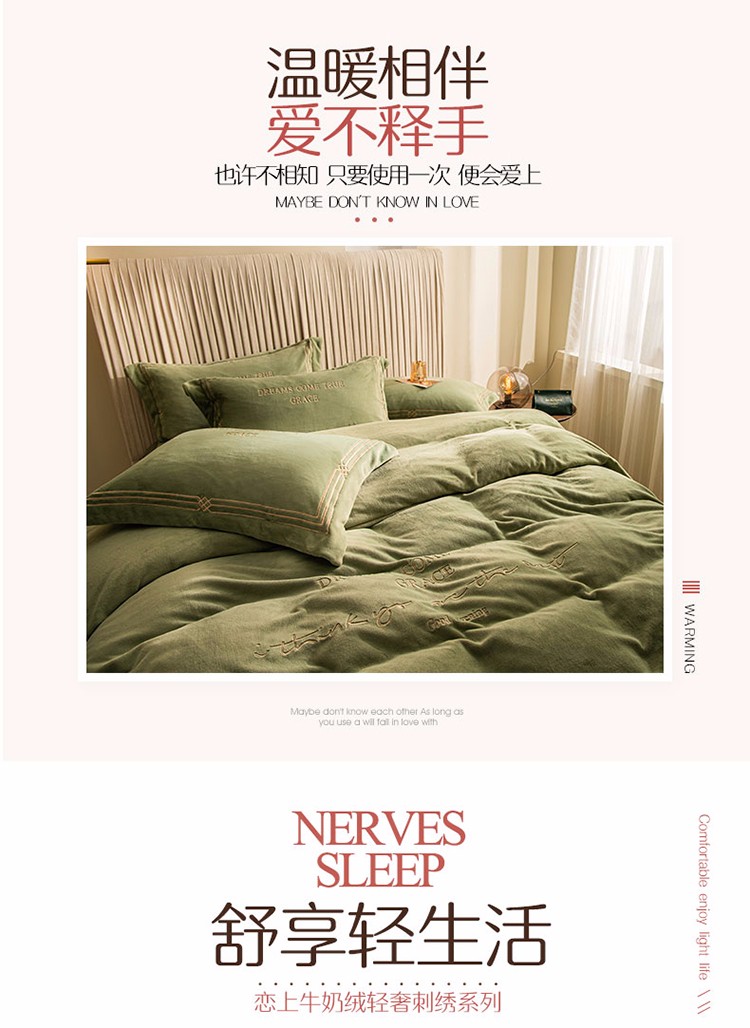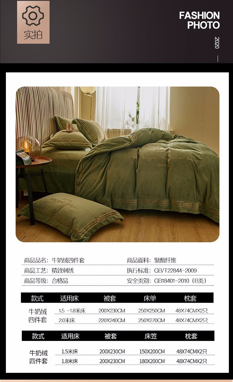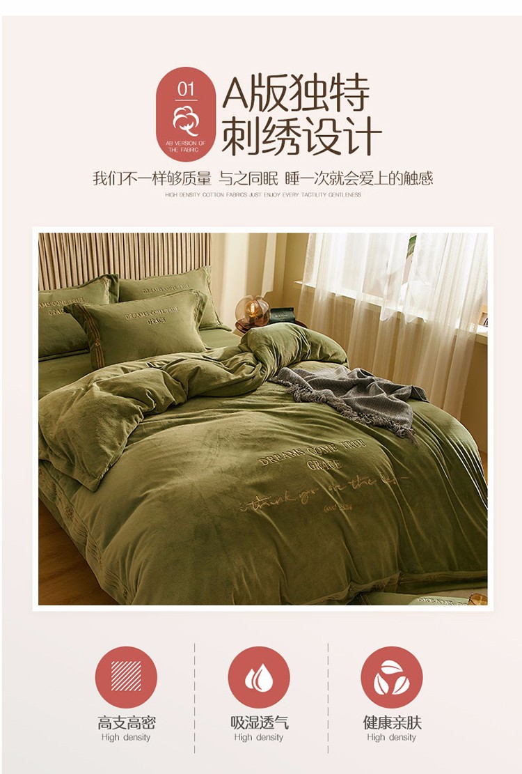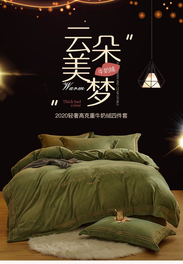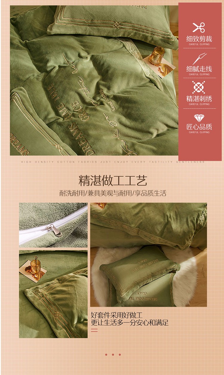 商品名称:米奈 2020新款水晶绒法莱绒牛奶绒绣边罗伊系列四件套 艾叶绿
