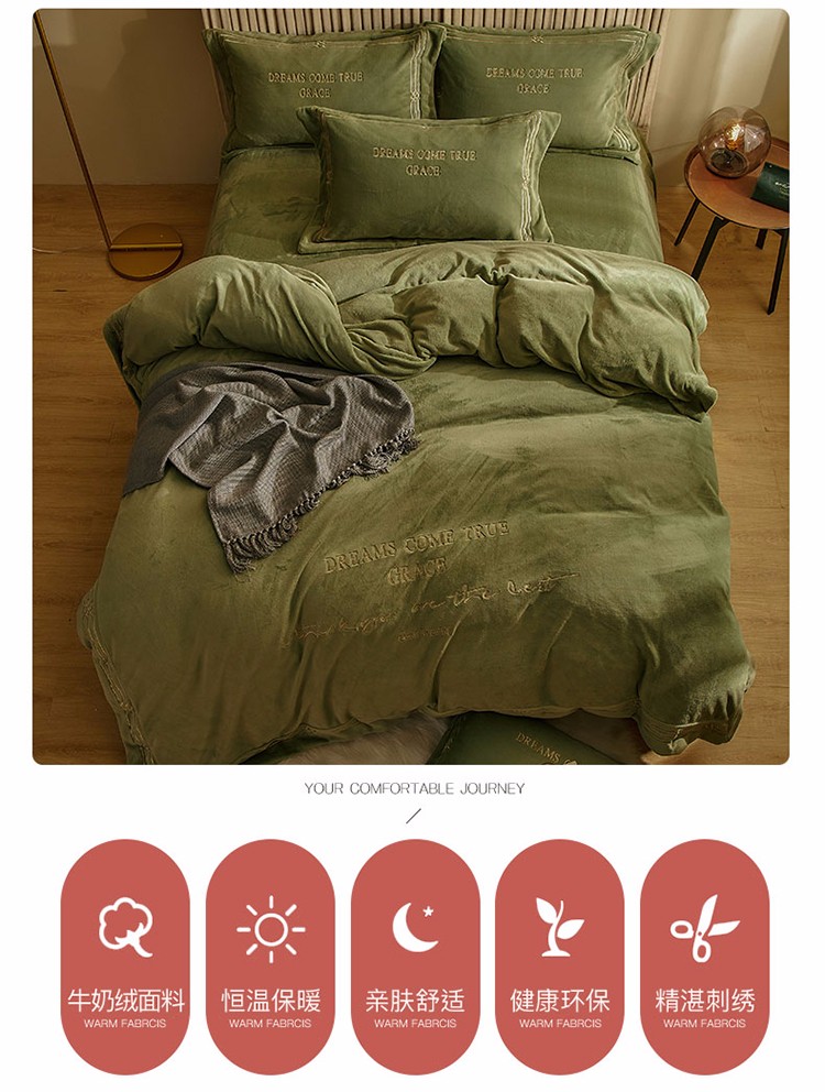 米奈 2020新款水晶绒法莱绒牛奶绒绣边罗伊系列四件套 艾叶绿