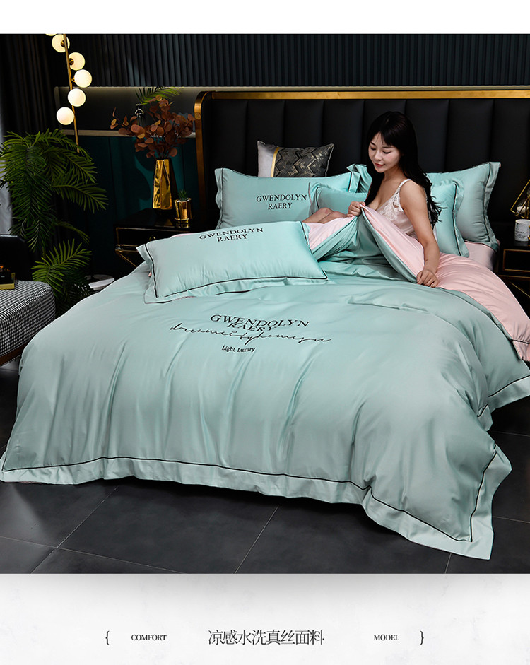 意尚风情2023新款绣花水洗真丝四件套 千韵-水绿