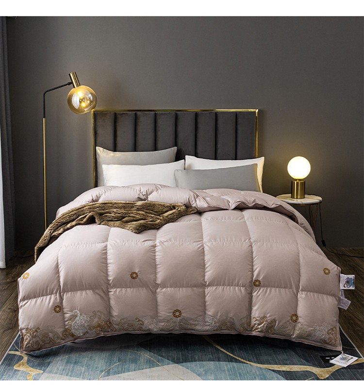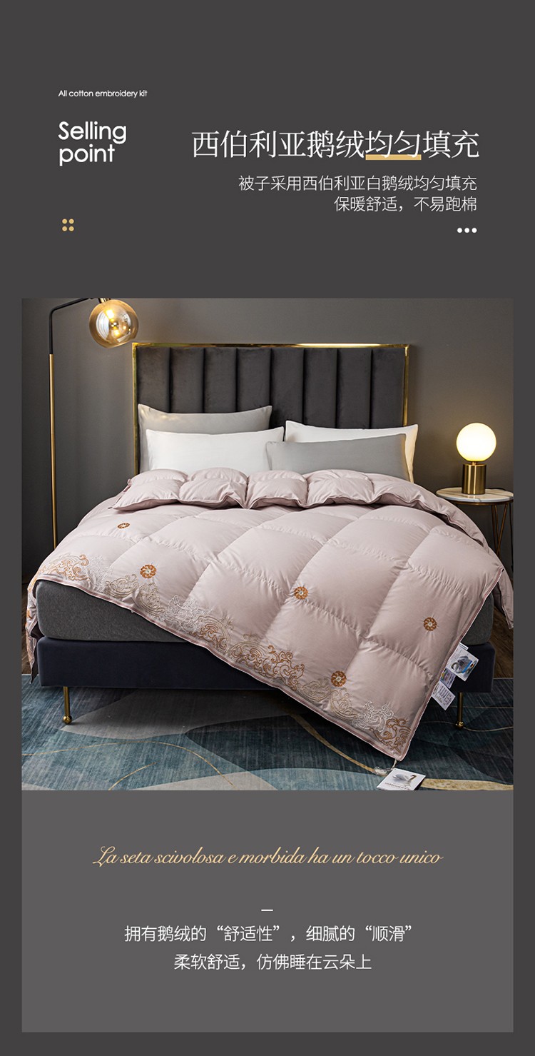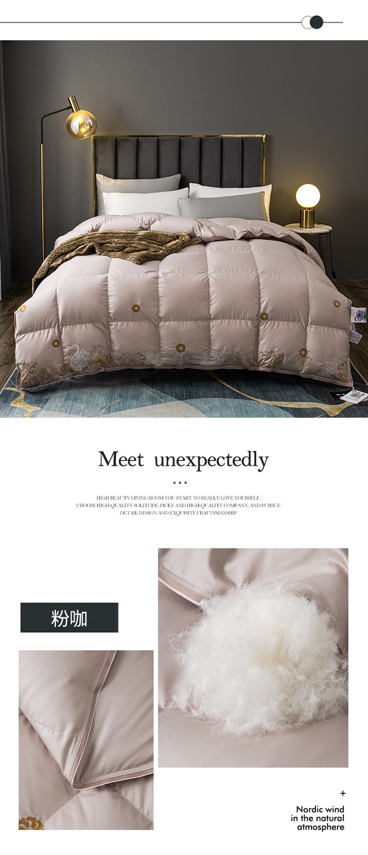 俏企鹅 2025新款绣花款-100s贡缎全棉白鹅绒被 粉咖